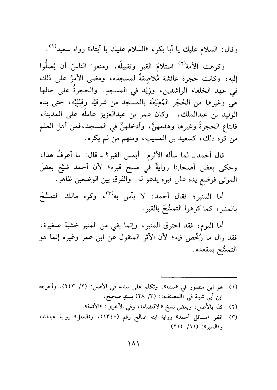 وكرهت الأمة (¬٢) استلامَ القبر وتقبيلَه، ومنعوا الناسَ أن يُصلُّوا إليه، وكانت حجرة عائشة مُلاصِقةً لمسجده، ومضى الأمرُ على ذلك في عهد الخلفاء الراشدين، وزِيْد في المسجدِ. والحجرةُ على حالها هي وغيرها من الحُجَر المُطِيْفَة بالمسجد من شرقيِّه وقِبْلِيِّه، حتى بناه الوليد بن عبد الملك، وكان عمر بن عبد العزيز عاملَه على المدينة، فابتاع الحجرةَ وغيرها وهدمهنَّ، وأدخلهنَّ في المسجد، فمن أهل العلم من كره ذلك، کسعيد بن المسيب، ومنهم من لم يكره.