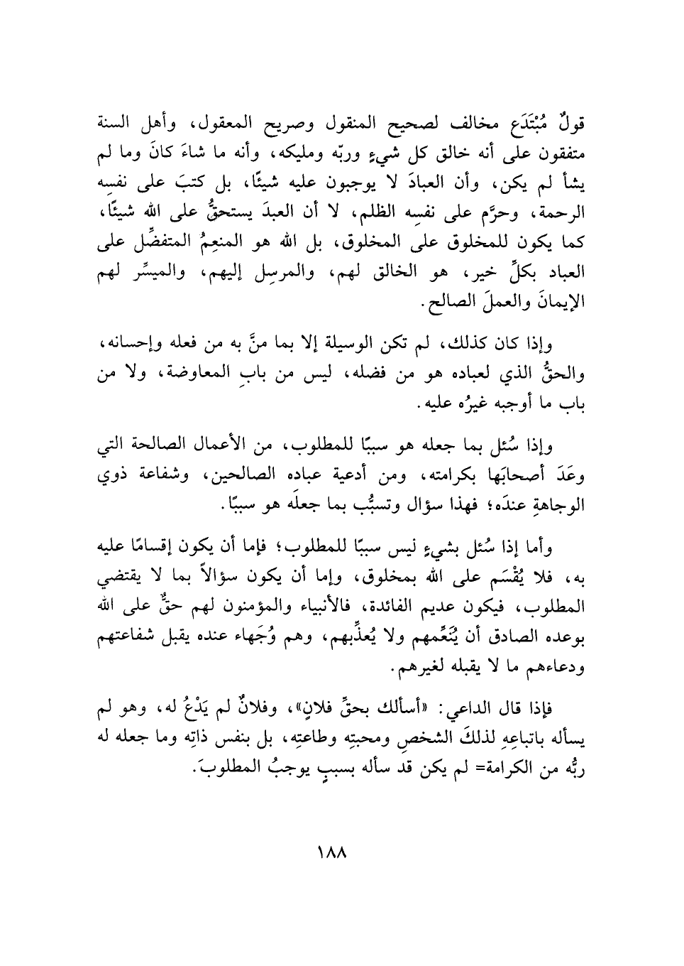 وأما إذا سُئل بشيءٍ ليس سببًا للمطلوب؛ فإما أن يكون إقسامًا عليه به، فلا يُقْسَم على الله بمخلوق، وإما أن يكون سؤالًا بما لا يقتضي المطلوب، فيكون عديم الفائدة، فالأنبياء والمؤمنون لهم حقٌّ على الله بوعده الصادق أن يُنَعِّمهم ولا يُعذِّبهم، وهم وُجَهاء عنده يقبل شفاعتهم ودعاءهم ما لا يقبله لغيرهم.