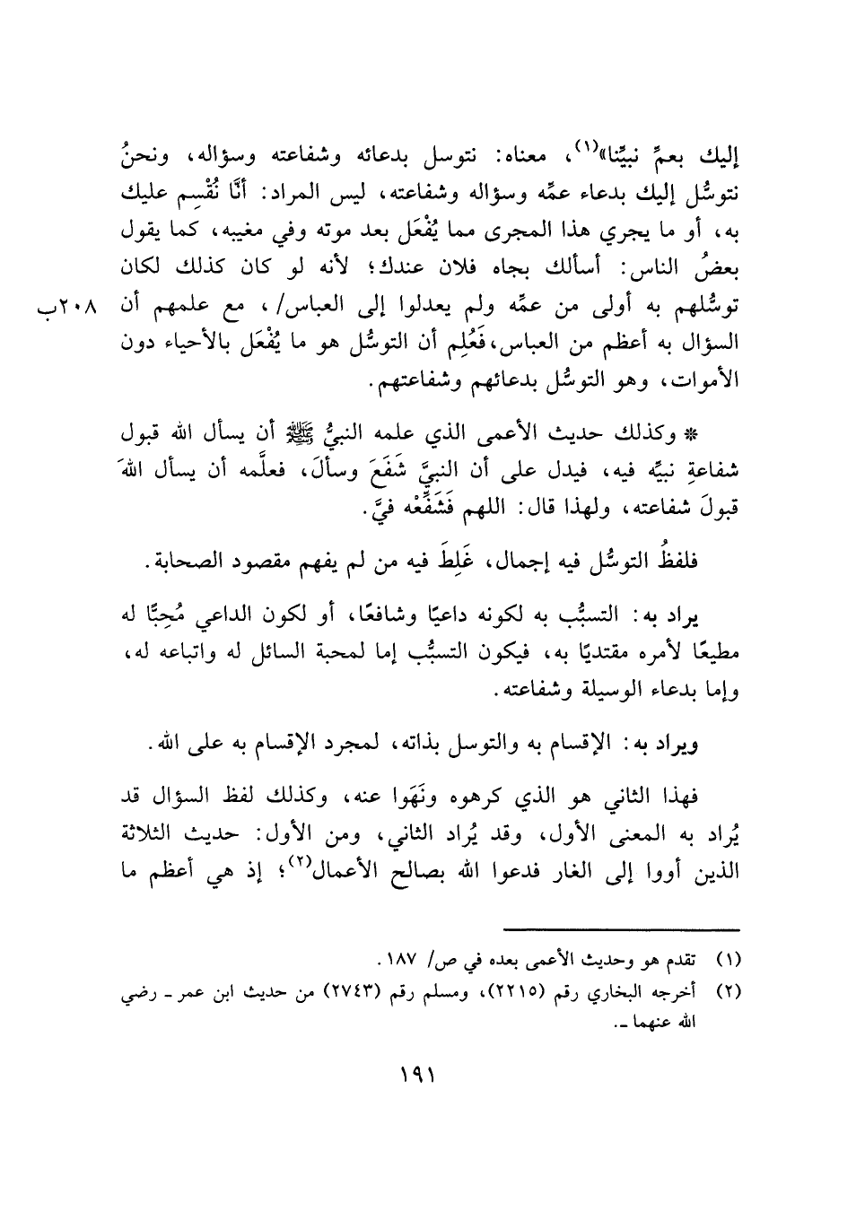 إليك بعمِّ نبيِّنا" (¬١) ، معناه: نتوسل بدعائه وشفاعته وسؤاله، ونحنُ نتوسُّل إليك بدعاء عمِّه وسؤاله وشفاعته، ليس المراد: أنَّا نُقْسِم عليك به، أو ما يجري هذا المجرى مما يُفْعَل بعد موته وفي مغيبه، كما يقول بعضُ الناس: أسألك بجاه فلان عندك؛ لأنه لو كان كذلك لكان توسُّلهم به أولى من عمِّه ولم يعدلوا إلى العباس، مع علمهم أن السؤال به أعظم من العباس، فَعُلِم أن التوسُّل هو ما يُفْعَل بالأحياء دون الأموات، وهو التوسُّل بدعائهم وشفاعتهم.