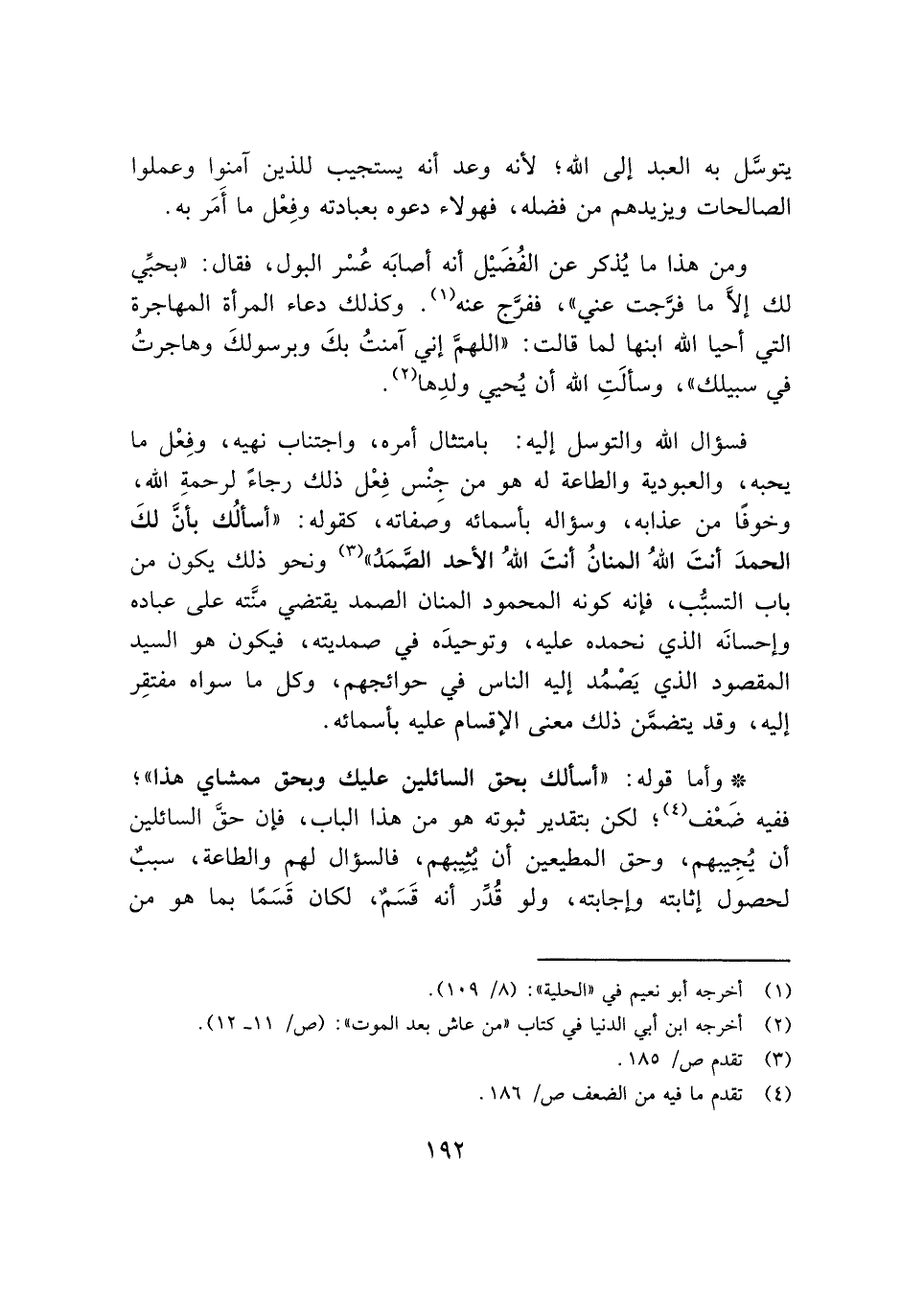 ومن هذا ما يُذكر عن الفُضَيْل أنه أصابَه عُسْر البول، فقال: "بحبِّي لك إلَّا ما فرَّجت عني"، ففرَّج عنه (¬١) . وكذلك دعاء المرأة المهاجرة التي أحيا الله ابنها لما قالت: "اللهمَّ إني آمنتُ بكَ وبرسولكَ وهاجرتُ في سبيلك"، وسألَتِ الله أن يُحيي ولدِها (¬٢) .