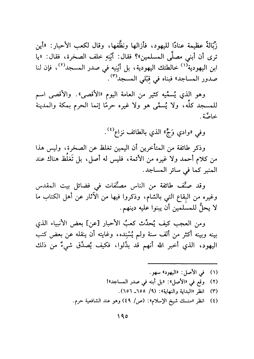 وقد صنَّف طائفة من الناس مصنَّفات في فضائل بيت المقدس وغيره من البِقاع التي بالشام، وذكروا فيها من الآثار عن أهل الكتاب ما لا يحلُّ للمسلمين أن يبنوا عليه دينهم.