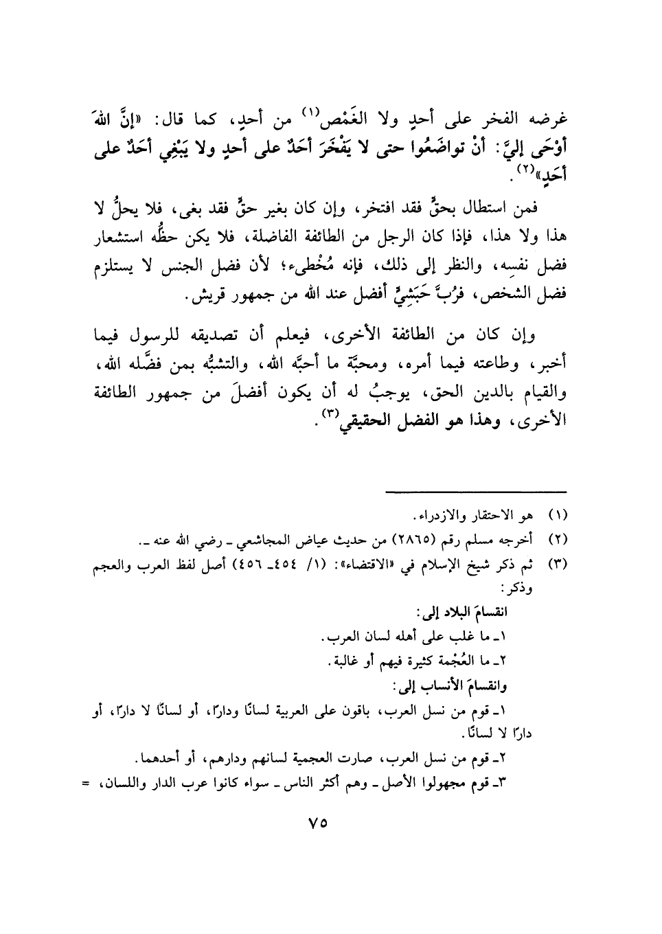 فمن استطال بحقٍّ فقد افتخر، وإن كان بغير حقٍّ فقد بغي، فلا يحلُّ لا هذا ولا هذا، فإذا كان الرجل من الطائفة الفاضلة، فلا يكن حظُّه استشعار فضل نفسِه، والنظر إلى ذلك، فإنه مْخْطئ؛ لأن فضل الجنس لا يستلزم فضل الشخص، فرُبَّ حَبَشِيٍّ أفضل عند الله من جمهور قريش.
