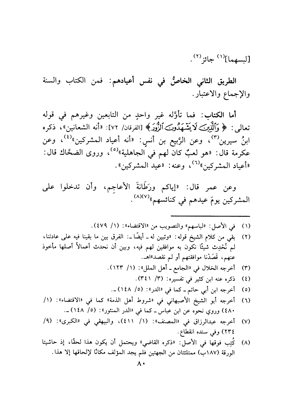 (¬٢) بقي من كلام الشيخ قوله: "وتبين له -أيضًا-: الفرق بين ما بقينا فيه على عادتنا، لم نُحَدِث شيئًا نكون به موافقين لهم فيه، وبين أن نحدث أعمالًا أصلها مأخوذ عنهم، قَصَدْنا موافقتهم أو لم نقصد" اهـ.