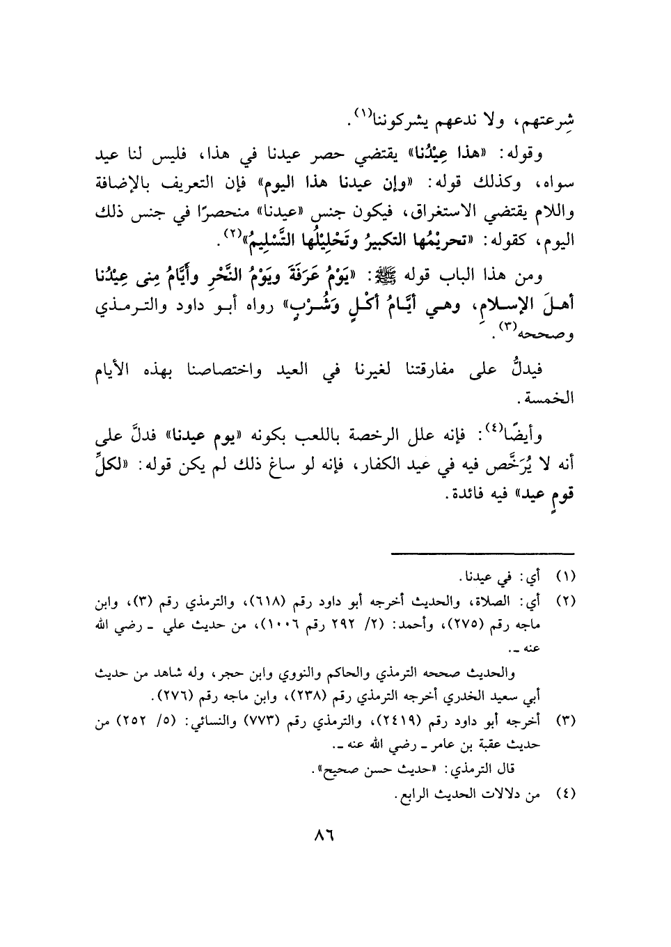 ومن هذا الباب قوله -صلى الله عليه وسلم-: "يَوْمُ عَرَفَةَ ويَوْمُ النَّحْرِ وأَيَّامُ مِنى عِيْدُنا أهلَ الإسلامِ، وهي أيَّامُ أكْلٍ وَشُرْبٍ" رواه أبو داود والترمذي وصححه (¬٣) .