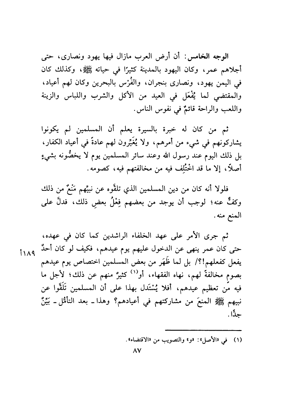 الوجه الخامس: أن أرض العرب ما زال فيها يهود ونصاري، حتى أجلاهم عمر، وكان اليهود بالمدينة كثيرًا في حياته -صلى الله عليه وسلم-، وكذلك كان في اليمن يهود، ونصاري بنجران، والفُرْس بالبحرين وكان لهم أعياد، والمقتضي لما يُفْعَل في العيد من الأكل والشرب واللباس والزينة واللعب والراحة قائمٌ في نفوس الناس.
