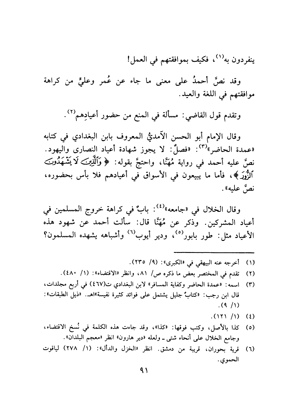 وقال الإمام أبو الحسن الآمديُّ المعروف بابن البغدادي في كتابه "عمدة الحاضر" (¬٣) : "فصلٌ: لا يجوز شهادة أعياد النصارى واليهود. نصَّ عليه أحمد في رواية مُهَنَّا، واحتجَّ بقوله: {وَالَّذِينَ لَا يَشْهَدُونَ الزُّورَ}، فأما ما يبيعون في الأسواق في أعيادهم فلا بأس بحضوره، نصَّ عليه".