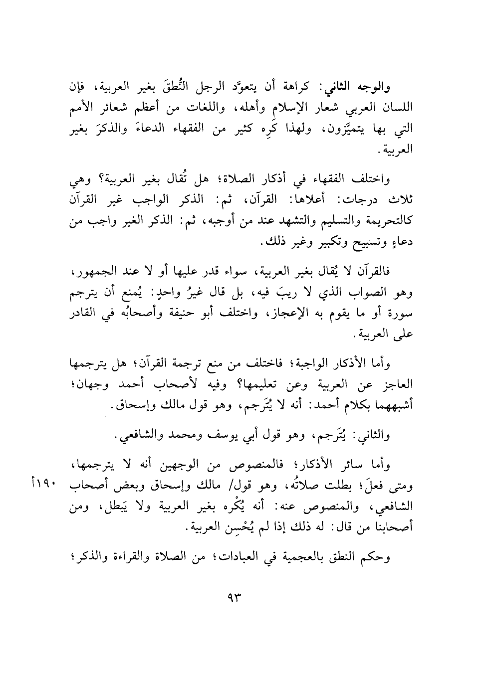 وأما الأذكار الواجبة؛ فاختلف من منع ترجمة القرآن؛ هل يترجمها العاجز عن العربية وعن تعليمها؟ وفيه لأصحاب أحمد وجهان؛ أشبههما بكلام أحمد: أنه لا يُتَرجم، وهو قول مالك وإسحاق.