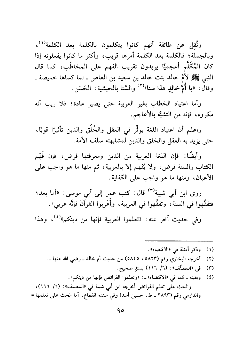 واعلم أن اعتياد اللغة يوثِّر في العقل والخُلُق والدين تأثيرًا قويًّا، حتى يزيد به العقل والخلق والدين لمشابهته سلف الأمة.