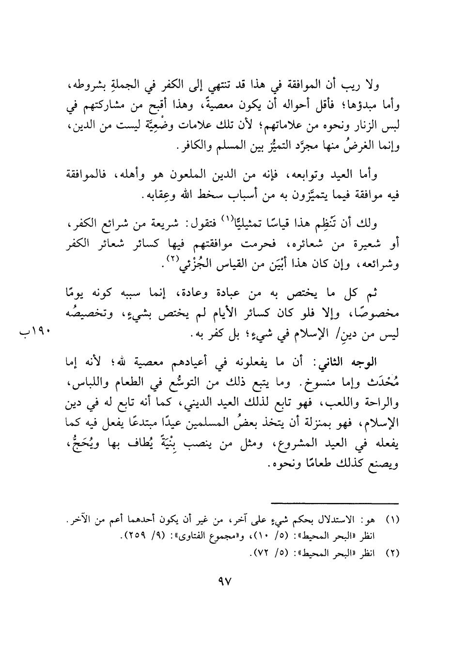 الوجه الثاني: أن ما يفعلونه في أعيادهم معصية الله؛ لأنه إما مُحْدَث وإما منسوخ. وما يتبع ذلك من التوسُّع في الطعام واللباس، والراحة واللعب، فهو تابع لذلك العيد الديني، كما أنه تابع له في دين الإسلام، فهو بمنزلة أن يتخذ بعضُ المسلمين عيدًا مبتدعًا يفعل فيه كما يفعله في العيد المشروع، ومثل من ينصب بِنْيَةً يُطاف بها ويُحَجُّ، ويصنع كذلك طعامًا ونحوه.