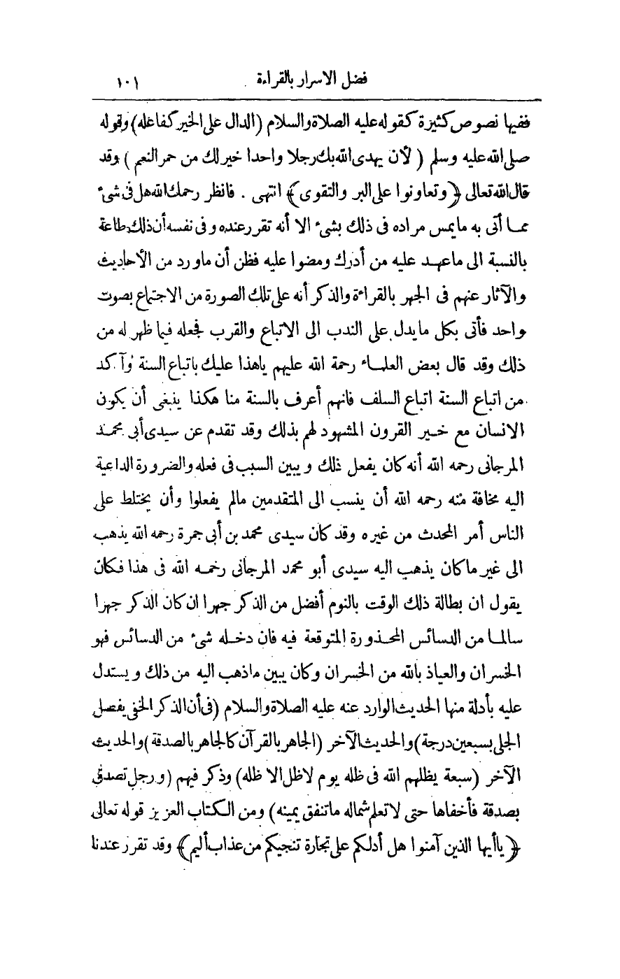 فَانْظُرْ رَحِمَك اللَّهُ هَلْ فِي شَيْءٍ مِمَّا أَتَى بِهِ مَا يَمَسُّ مُرَادَهُ فِي ذَلِكَ بِشَيْءٍ إلَّا أَنَّهُ تَقَرَّرَ عِنْدَهُ وَفِي نَفْسِهِ أَنَّ ذَلِكَ طَاعَةٌ بِالنِّسْبَةِ إلَى مَا عَهِدَ عَلَيْهِ مَنْ أَدْرَكَ وَمَضَوْا عَلَيْهِ فَظَنَّ أَنَّ مَا وَرَدَ مِنْ الْأَحَادِيثِ وَالْآثَارِ عَنْهُمْ فِي الْجَهْرِ بِالْقِرَاءَةِ وَالذِّكْرِ أَنَّهُ عَلَى تِلْكَ الصُّورَةِ الِاجْتِمَاعِ بِصَوْتٍ وَاحِدٍ فَأَتَى بِكُلِّ مَا يَدُلُّ عَلَى النَّدْبِ إلَى الِاتِّبَاعِ وَالْقُرْبِ فَجَعَلَهُ فِيمَا ظَهَرَ لَهُ مِنْ ذَلِكَ، وَقَدْ قَالَ بَعْضُ الْعُلَمَاءِ رَحْمَةُ اللَّهِ عَلَيْهِمْ يَا هَذَا عَلَيْك بِاتِّبَاعِ السُّنَّةِ وَآكَدُ مِنْ اتِّبَاعِ السُّنَّةِ اتِّبَاعُ السَّلَفِ فَإِنَّهُمْ أَعْرَفُ بِالسُّنَّةِ مِنَّا هَكَذَا يَنْبَغِي أَنْ يَكُونَ الْإِنْسَانُ مَعَ خَيْرِ الْقُرُونِ الْمَشْهُودِ لَهُمْ بِذَلِكَ، وَقَدْ تَقَدَّمَ عَنْ سَيِّدِي أَبِي مُحَمَّدٍ الْمَرْجَانِيِّ - رَحِمَهُ اللَّهُ - أَنَّهُ كَانَ يَفْعَلُ ذَلِكَ وَيُبَيِّنُ السَّبَبَ فِي فِعْلِهِ وَالضَّرُورَةَ الدَّاعِيَةَ إلَيْهِ مَخَافَةً مِنْهُ - رَحِمَهُ اللَّهُ - أَنْ يُنْسَبَ إلَى الْمُتَقَدِّمِينَ مَا لَمْ يَفْعَلُوا وَأَنْ يَخْتَلِطَ عَلَى النَّاسِ أَمْرُ الْمُحْدِثِ مِنْ غَيْرِهِ، وَقَدْ كَانَ سَيِّدِي مُحَمَّدُ بْنُ أَبِي جَمْرَةَ - رَحِمَهُ اللَّهُ - يَذْهَبُ إلَى غَيْرِ مَا كَانَ يَذْهَبُ إلَيْهِ سَيِّدِي أَبُو مُحَمَّدٍ الْمَرْجَانِيِّ - رَحِمَهُ اللَّهُ - فِي هَذَا فَكَانَ يَقُولُ إنَّ بَطَالَةَ ذَلِكَ الْوَقْتِ بِالنَّوْمِ أَفْضَلُ مِنْ الذِّكْرِ جَهْرًا إنْ كَانَ الذِّكْرُ جَهْرًا سَالِمًا مِنْ الدَّسَائِسِ الْمَحْذُورَةِ الْمُتَوَقَّعَةِ فِيهِ فَإِنْ دَخَلَهُ شَيْءٌ مِنْ الدَّسَائِسِ فَهُوَ الْخُسْرَانُ وَالْعِيَاذُ بِاَللَّهِ مِنْ الْخُسْرَانِ وَكَانَ يُبَيِّنُ مَا ذَهَبَ إلَيْهِ مِنْ ذَلِكَ وَيَسْتَدِلُّ عَلَيْهِ بِأَدِلَّةٍ مِنْهَا الْحَدِيثُ الْوَارِدُ عَنْهُ - عَلَيْهِ الصَّلَاةُ وَالسَّلَامُ - فِي أَنَّ «الذِّكْرَ الْخَفِيَّ يَفْضُلُ الْجَلِيَّ بِسَبْعِينَ دَرَجَةً» .