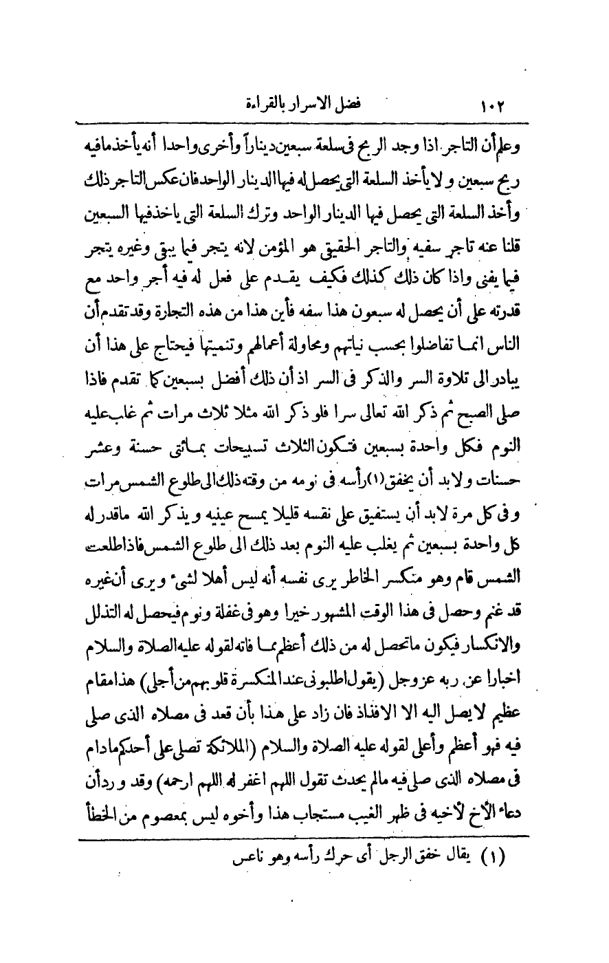 وَعُلِمَ أَنَّ التَّاجِرَ إذَا وَجَدَ الرِّبْحَ فِي سِلْعَةٍ سَبْعِينَ دِينَارًا وَأُخْرَى وَاحِدًا أَنَّهُ يَأْخُذُ مَا فِيهِ رِبْحُ سَبْعِينَ وَلَا يَأْخُذُ السِّلْعَةَ الَّتِي يَحْصُلُ لَهُ فِيهَا الدِّينَارُ الْوَاحِدُ فَإِنْ عَكَسَ التَّاجِرُ ذَلِكَ وَأَخَذَ السِّلْعَةَ الَّتِي يَحْصُلُ فِيهَا الدِّينَارُ الْوَاحِدُ وَتَرَكَ السِّلْعَةَ الَّتِي يَأْخُذُ فِيهَا السَّبْعِينَ قُلْنَا عَنْهُ تَاجِرٌ سَفِيهٌ وَالتَّاجِرُ الْحَقِيقِيُّ هُوَ الْمُؤْمِنُ لِأَنَّهُ يَتَّجِرُ فِيمَا يَبْقَى وَغَيْرُهُ يَتَّجِرُ فِيمَا يَفْنَى، وَإِذَا كَانَ ذَلِكَ كَذَلِكَ فَكَيْفَ يَقْدُمُ عَلَى فِعْلٍ لَهُ فِيهِ أَجْرٌ وَاحِدٌ مَعَ قُدْرَتِهِ عَلَى أَنْ يَحْصُلَ لَهُ سَبْعُونَ هَذَا سَفَهٌ فَأَيْنَ هَذَا مِنْ هَذِهِ التِّجَارَةِ، وَقَدْ تَقَدَّمَ أَنَّ النَّاسَ إنَّمَا تَفَاضَلُوا بِحَسَبِ نِيَّاتِهِمْ وَمُحَاوِلَةِ أَعْمَالِهِمْ وَتَنْمِيَتِهَا فَيَحْتَاجُ عَلَى هَذَا أَنْ يُبَادِرَ إلَى تِلَاوَةِ السِّرِّ وَالذِّكْرِ فِي السِّرِّ إذْ أَنَّ ذَلِكَ أَفْضَلُ بِسَبْعِينَ كَمَا تَقَدَّمَ.