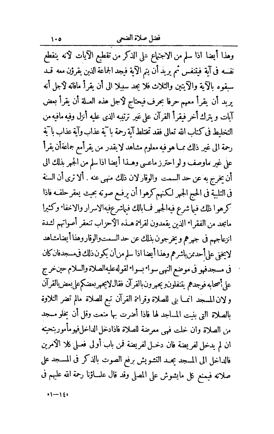 أَلَا تَرَى أَنَّ السُّنَّةَ فِي التَّلْبِيَةِ فِي الْحَجِّ الْجَهْرُ لَكِنَّهُمْ كَرِهُوا أَنْ يَرْفَعَ صَوْتَهُ بِحَيْثُ يَعْقِرُ حَلْقَهُ فَإِذَا كَرِهُوا ذَلِكَ فِيمَا شُرِعَ فِيهِ الْجَهْرُ فَمَا بَالُك فِيمَا شُرِعَ فِيهِ الْإِسْرَارُ وَالْإِخْفَاءُ وَكَثِيرًا مَا تَجِدُ مِنْ الْفُقَرَاءِ الَّذِينَ يَقْعُدُونَ لِقِرَاءَةِ هَذِهِ الْأَحْزَابِ تَنْعَقِرُ أَصْوَاتُهُمْ لِشِدَّةِ انْزِعَاجِهِمْ فِي جَهْرِهِمْ وَيَخْرُجُونَ بِذَلِكَ عَنْ حَدِّ السَّمْتِ وَالْوَقَارِ وَهَذَا أَيْضًا مُشَاهَدٌ لَا يَخْفَى عَلَى أَحَدٍ مِمَّنْ بَاشَرَهُمْ وَهَذَا أَيْضًا إذَا سَلِمَ مِنْ أَنْ يَكُونَ ذَلِكَ فِي مَسْجِدٍ فَإِنْ كَانَ فِي مَسْجِدٍ فَهُوَ فِي مَوْضِعِ النَّهْيِ سَوَاءٌ بِسَوَاءٍ «قَوْلُهُ - عَلَيْهِ الصَّلَاةُ وَالسَّلَامُ - حِينَ خَرَجَ عَلَى أَصْحَابِهِ فَوَجَدَهُمْ يَتَنَفَّلُونَ وَيَجْهَرُونَ بِالْقُرْآنِ فَقَالَ لَا يَجْهَرْ بَعْضُكُمْ عَلَى بَعْضٍ بِالْقُرْآنِ» وَلِأَنَّ الْمَسْجِدَ إنَّمَا بُنِيَ لِلصَّلَاةِ وَقِرَاءَةُ الْقُرْآنِ تَبَعٌ لِلصَّلَاةِ مَا لَمْ تَضُرَّ التِّلَاوَةُ بِالصَّلَاةِ الَّتِي بُنِيَتْ الْمَسَاجِدُ لَهَا فَإِذَا أَضَرَّتْ بِهَا مُنِعَتْ وَقَلَّ أَنْ يَخْلُوَ مَسْجِدٌ مِنْ الصَّلَاةِ وَإِنْ خَلَتْ فَهِيَ مُعَرَّضَةٌ لِلصَّلَاةِ فَإِذَا دَخَلَ الدَّاخِلُ فَهُوَ مَأْمُورٌ بِتَحِيَّتِهِ إنْ لَمْ يَدْخُلْ لِفَرِيضَةٍ فَإِنْ دَخَلَ لِفَرِيضَةٍ فَمِنْ بَابِ أَوْلَى فَعَلَى كِلَا الْأَمْرَيْنِ فَالدَّاخِلُ إلَى الْمَسْجِدِ يَجِدُ التَّشْوِيشَ بِرَفْعِ الصَّوْتِ بِالذِّكْرِ فِي الْمَسْجِدِ عَلَى صَلَاتِهِ فَيُمْنَعُ كُلُّ مَا يُشَوِّشُ عَلَى الْمُصَلِّي.