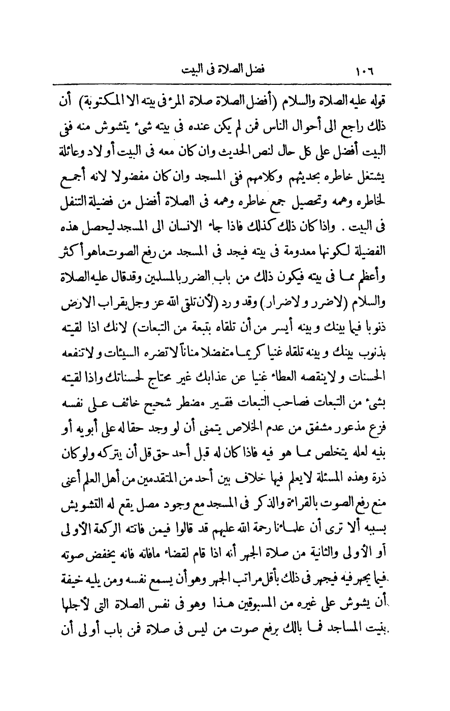 قَوْلِهِ - عَلَيْهِ الصَّلَاةُ وَالسَّلَامُ - «أَفْضَلُ الصَّلَاةِ صَلَاةُ الْمَرْءِ فِي بَيْتِهِ إلَّا الْمَكْتُوبَةَ» أَنَّ ذَلِكَ رَاجِعٌ إلَى أَحْوَالِ النَّاسِ فَمَنْ لَمْ يَكُنْ عِنْدَهُ فِي بَيْتِهِ شَيْءٌ يَتَشَوَّشُ مِنْهُ فَفِي الْبَيْتِ أَفْضَلُ عَلَى كُلِّ حَالٍ لِنَصِّ الْحَدِيثِ وَإِنْ كَانَ مَعَهُ فِي الْبَيْتِ أَوْلَادٌ وَعَائِلَةٌ يَشْتَغِلُ خَاطِرُهُ بِحَدِيثِهِمْ وَكَلَامِهِمْ فَفِي الْمَسْجِدِ وَإِنْ كَانَ مَفْضُولًا لِأَنَّهُ أَجْمَعُ لِخَاطِرِهِ وَهَمِّهِ وَتَحْصِيلُ جَمْعِ خَاطِرِهِ وَهَمِّهِ فِي الصَّلَاةِ أَفْضَلُ مِنْ فَضِيلَةِ التَّنَفُّلِ فِي الْبَيْتِ، وَإِذَا كَانَ ذَلِكَ كَذَلِكَ فَإِذَا جَاءَ الْإِنْسَانُ إلَى الْمَسْجِدِ لِيُحَصِّلَ هَذِهِ الْفَضِيلَةَ لِكَوْنِهَا مَعْدُومَةً فِي بَيْتِهِ فَيَجِدُ فِي الْمَسْجِدِ مِنْ رَفْعِ الصَّوْتِ مَا هُوَ أَكْثَرُ وَأَعْظَمُ مِمَّا فِي بَيْتِهِ فَيَكُونُ ذَلِكَ مِنْ بَابِ الضَّرَرِ بِالْمُسْلِمِينَ، وَقَدْ قَالَ - عَلَيْهِ الصَّلَاةُ وَالسَّلَامُ - «لَا ضَرَرَ وَلَا ضِرَارَ» .