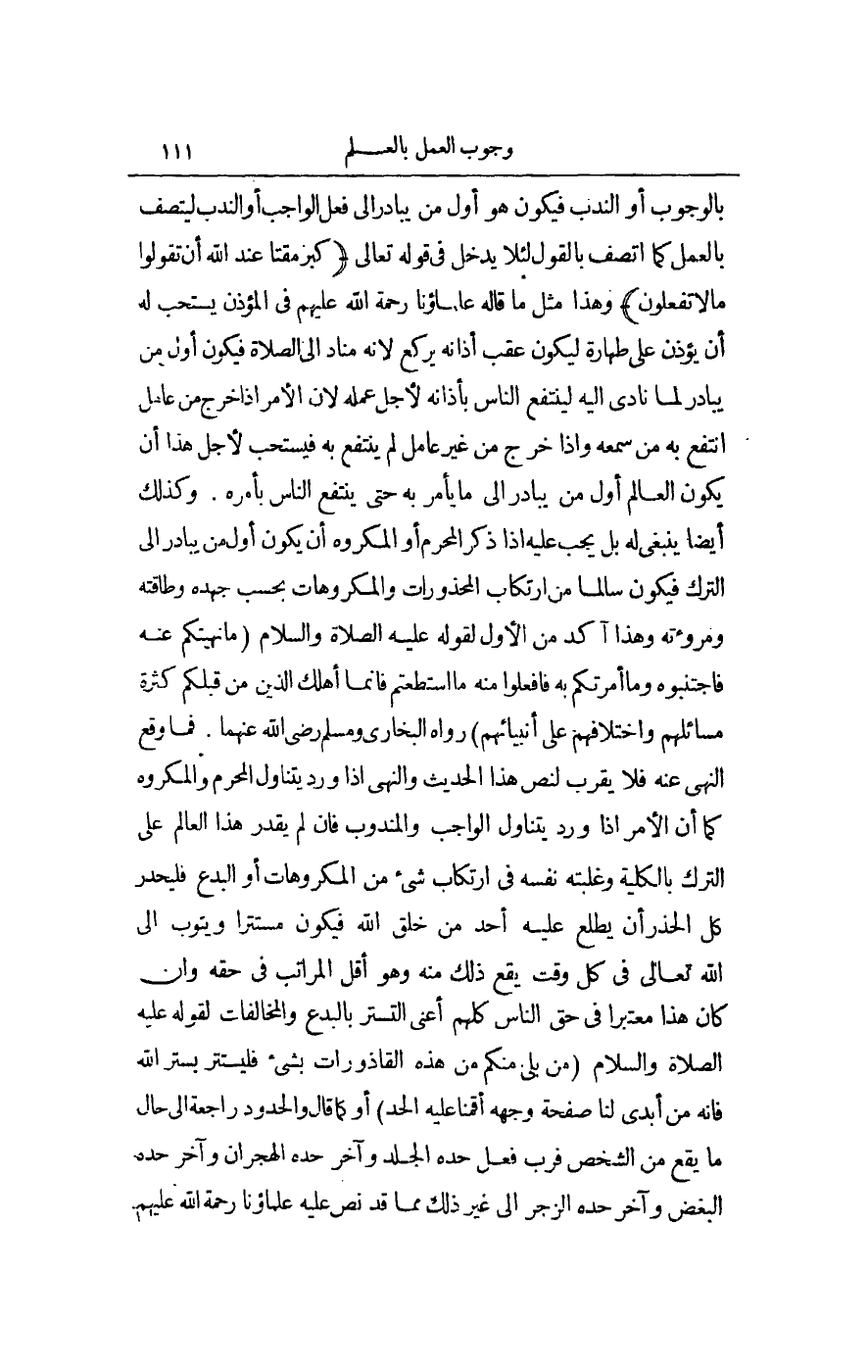 وَكَذَلِكَ أَيْضًا يَنْبَغِي لَهُ بَلْ يَجِبُ عَلَيْهِ إذَا ذَكَرَ الْمُحَرَّمَ أَوْ الْمَكْرُوهَ أَنْ يَكُونَ أَوَّلَ مَنْ يُبَادِرُ إلَى التَّرْكِ فَيَكُونُ سَالِمًا مِنْ ارْتِكَابِ الْمَحْذُورَاتِ وَالْمَكْرُوهَاتِ بِحَسَبِ جَهْدِهِ وَطَاقَتِهِ وَمُرُوءَتِهِ وَهَذَا آكَدُ مِنْ الْأَوَّلِ لِقَوْلِهِ - عَلَيْهِ الصَّلَاةُ وَالسَّلَامُ - «مَا نَهَيْتُكُمْ عَنْهُ فَاجْتَنِبُوهُ وَمَا أَمَرْتُكُمْ بِهِ فَافْعَلُوا مِنْهُ مَا اسْتَطَعْتُمْ فَإِنَّمَا أَهْلَكَ الَّذِينَ مِنْ قَبْلِكُمْ كَثْرَةُ مَسَائِلِهِمْ وَاخْتِلَافُهُمْ عَلَى أَنْبِيَائِهِمْ» رَوَاهُ الْبُخَارِيُّ وَمُسْلِمٌ - رَضِيَ اللَّهُ عَنْهُمَا -.