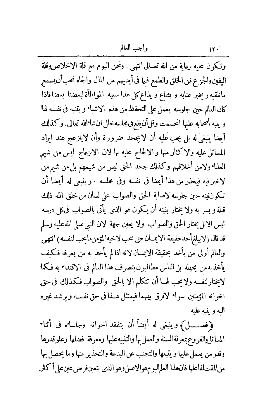 وَنَحْنُ الْيَوْمَ مَعَ قِلَّةِ الْإِخْلَاصِ وَقِلَّةِ الْيَقِينِ وَالْجَزَعِ مِنْ الْخَلْقِ وَالطَّمَعِ فِيمَا فِي أَيْدِيهِمْ مِنْ الْمَالِ وَالْجَاهِ نُحِبُّ أَنْ يُسْمَعَ مَا نُلْقِيهِ وَيُخْبَرُ عَنَّا بِهِ وَيُشَاعُ وَيُذَاعُ كُلُّ هَذَا سَبَبُهُ الْمُوَاطَأَةُ لِبَعْضِنَا بَعْضًا فَإِذَا كَانَ الْعَالِمُ حِينَ جُلُوسِهِ يَعْمَلُ عَلَى التَّحَفُّظِ مِنْ هَذِهِ الْأَشْيَاءِ وَيَتَنَبَّهُ فِي نَفْسِهِ لَهَا وَيُنَبِّهُ أَصْحَابَهُ عَلَيْهَا انْحَسَمَتْ وَقَلَّ أَنْ يَقَعَ فِي مَجْلِسِهِ خَلَلٌ إنْ شَاءَ اللَّهُ تَعَالَى.