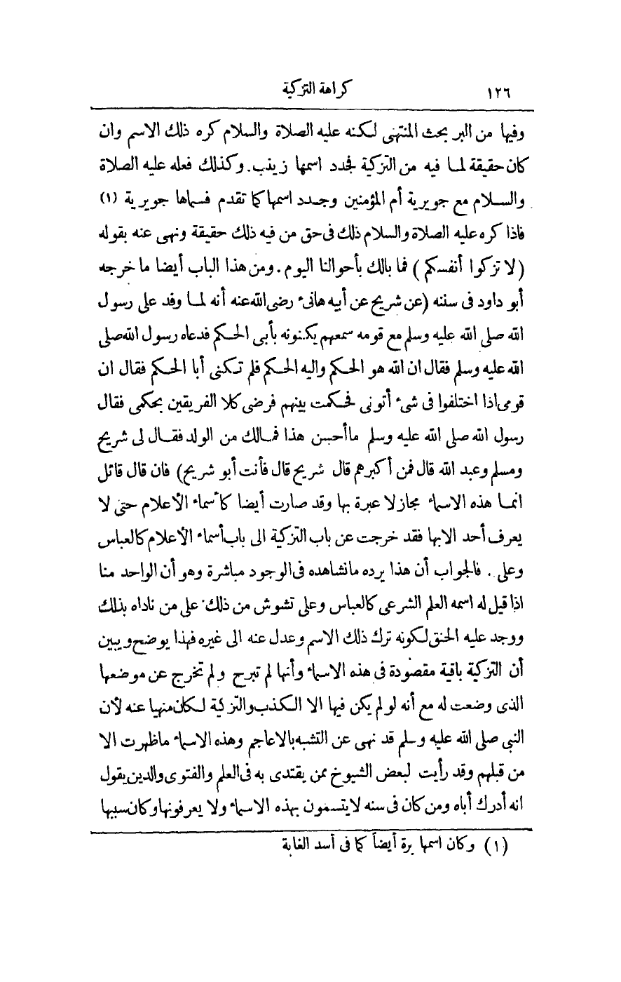 وَفِيهَا مِنْ الْبِرِّ بِحَيْثُ الْمُنْتَهَى؛ لِأَنَّهُ - عَلَيْهِ الصَّلَاةُ وَالسَّلَامُ - كَرِهَ ذَلِكَ الِاسْمَ وَإِنْ كَانَ حَقِيقَةً لِمَا فِيهِ مِنْ التَّزْكِيَةِ فَجَدَّدَ اسْمَهَا زَيْنَبَ، وَكَذَلِكَ «فِعْلُهُ - عَلَيْهِ الصَّلَاةُ وَالسَّلَامُ - مَعَ جُوَيْرِيَةَ أُمِّ الْمُؤْمِنِينَ وَجَدَّدَ اسْمَهَا كَمَا تَقَدَّمَ فَسَمَّاهَا جُوَيْرِيَةَ» ، فَإِذَا كَرِهَ - عَلَيْهِ الصَّلَاةُ وَالسَّلَامُ - ذَلِكَ فِي حَقِّ مَنْ فِيهِ ذَلِكَ حَقِيقَةً وَنَهَى عَنْهُ بِقَوْلِهِ «لَا تُزَكُّوا أَنْفُسَكُمْ» فَمَا بَالُك بِأَحْوَالِنَا الْيَوْمَ. وَمِنْ هَذَا الْبَابِ أَيْضًا مَا خَرَّجَهُ أَبُو دَاوُد فِي سُنَنِهِ عَنْ شُرَيْحٍ عَنْ أَبِيهِ هَانِئٍ - رَضِيَ اللَّهُ عَنْهُ - أَنَّهُ «لَمَّا وَفَدَ عَلَى رَسُولِ اللَّهِ - صَلَّى اللَّهُ عَلَيْهِ وَسَلَّمَ - مَعَ قَوْمِهِ سَمِعَهُمْ يُكَنُّونَهُ بِأَبِي الْحَكَمِ فَدَعَاهُ رَسُولُ اللَّهِ - صَلَّى اللَّهُ عَلَيْهِ وَسَلَّمَ - فَقَالَ: إنَّ اللَّهَ هُوَ الْحَكَمُ وَإِلَيْهِ الْحُكْمُ فَلِمَ تُكَنَّى أَبَا الْحَكَمِ، فَقَالَ: إنَّ قَوْمِي إذَا اخْتَلَفُوا فِي شَيْءٍ أَتَوْنِي فَحَكَمْتُ بَيْنَهُمْ فَرَضِيَ كِلَا الْفَرِيقَيْنِ بِحُكْمِي، فَقَالَ رَسُولُ اللَّهِ - صَلَّى اللَّهُ عَلَيْهِ وَسَلَّمَ -: مَا أَحْسَنَ هَذَا فَمَا لَكَ مِنْ الْوَلَدِ، فَقَالَ: لِي شُرَيْحٌ وَمُسْلِمٌ وَعَبْدُ اللَّهِ، قَالَ: فَمَنْ أَكْبَرُهُمْ، قَالَ: شُرَيْحٌ، قَالَ: فَأَنْتَ أَبُو شُرَيْحٍ» .