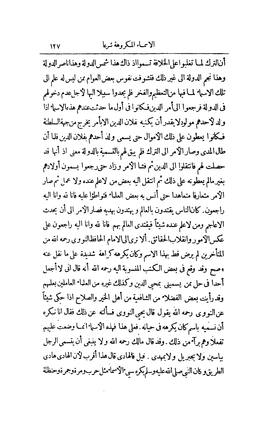 أَنَّ التُّرْكَ لَمَّا تَغَلَّبُوا عَلَى الْخِلَافَةِ تَسَمَّوْا إذْ ذَاكَ هَذَا شَمْسُ الدَّوْلَةِ، وَهَذَا نَاصِرُ الدَّوْلَةِ، وَهَذَا نَجْمُ الدَّوْلَةِ إلَى غَيْرِ ذَلِكَ فَتَشَوَّفَتْ نُفُوسُ بَعْضِ الْعَوَامّ مِمَّنْ لَيْسَ لَهُ عِلْمٌ إلَى تِلْكَ الْأَسْمَاءِ لِمَا فِيهَا مِنْ التَّعْظِيمِ وَالْفَخْرِ، فَلَمْ يَجِدُوا سَبِيلًا إلَيْهَا لِأَجْلِ عَدَمِ دُخُولِهِمْ فِي الدَّوْلَةِ فَرَجَعُوا إلَى أَمْرِ الدَّيْنِ، فَكَانُوا فِي أَوَّلِ مَا حَدَثَتْ عِنْدَهُمْ هَذِهِ الْأَسْمَاءُ إذَا وُلِدَ لِأَحَدِهِمْ مَوْلُودٌ لَا يَقْدِرُ أَنْ يُكَنِّيَهُ لِفُلَانِ الدِّينِ إلَّا بِأَمْرٍ يَخْرُجُ مِنْ جِهَةِ السَّلْطَنَةِ فَكَانُوا يُعْطُونَ عَلَى ذَلِكَ الْأَمْوَالَ حَتَّى يُسَمَّى وَلَدُ أَحَدِهِمْ بِفُلَانِ الدِّينِ، فَلَمَّا أَنْ طَالَ الْمَدَى وَصَارَ الْأَمْرُ إلَى التُّرْكِ فَلَمْ يَبْقَ لَهُمْ بِالتَّسْمِيَةِ بِالدَّوْلَةِ مَعْنًى إذْ أَنَّهَا قَدْ حَصَلَتْ لَهُمْ فَانْتَقَلُوا إلَى الدَّيْنِ، ثُمَّ فَشَا الْأَمْرُ وَزَادَ حَتَّى رَجَعُوا يُسَمُّونَ أَوْلَادَهُمْ بِغَيْرِ مَالٍ يُعْطُونَهُ عَلَى ذَلِكَ، ثُمَّ انْتَقَلَ إلَيْهِ بَعْضُ مَنْ لَا عِلْمَ عِنْدَهُ وَلَا عَمَلَ، ثُمَّ صَارَ الْأَمْرُ مُتَعَارَفًا مُتَعَاهَدًا حَتَّى أَنِسَ بِهِ بَعْضُ الْعُلَمَاءِ فَتَوَاطَئُوا عَلَيْهِ، فَإِنَّا لِلَّهِ وَإِنَّا إلَيْهِ رَاجِعُونَ. كَانَ النَّاسُ يَقْتَدُونَ بِالْعَالِمِ وَيَهْتَدُونَ بِهَدْيِهِ فَصَارَ الْأَمْرُ إلَى أَنْ يُحْدِثَ الْأَعَاجِمُ، وَمَنْ لَا عِلْمَ عِنْدَهُ شَيْئًا فَيُقْتَدَى بِالْعَالِمِ وَبِهِمْ، فَإِنَّا لِلَّهِ وَإِنَّا إلَيْهِ رَاجِعُونَ عَلَى عَكْسِ الْأُمُورِ وَانْقِلَابِ الْحَقَائِقِ. أَلَا تَرَى إلَى الْإِمَامِ الْحَافِظِ النَّوَوِيِّ - رَحِمَهُ اللَّهُ - مِنْ الْمُتَأَخِّرِينَ لَمْ يَرْضَ قَطُّ بِهَذَا الِاسْمِ وَكَانَ يَكْرَهُهُ كَرَاهَةً شَدِيدَةً عَلَى مَا نُقِلَ عَنْهُ وَصَحَّ، وَقَدْ وَقَعَ فِي بَعْضِ الْكُتُبِ الْمَنْسُوبَةِ إلَيْهِ - رَحِمَهُ اللَّهُ - أَنَّهُ قَالَ: إنِّي لَا أَجْعَلُ أَحَدًا فِي حِلٍّ مِمَّنْ يُسَمِّينِي بِمُحْيِي الدَّيْنِ وَكَذَلِكَ غَيْرُهُ مِنْ الْعُلَمَاءِ الْعَامِلِينَ بِعِلْمِهِمْ، وَقَدْ رَأَيْتُ بَعْضَ الْفُضَلَاءِ مِنْ الشَّافِعِيَّةِ مِنْ أَهْلِ الْخَيْرِ وَالصَّلَاحِ إذَا حَكَى شَيْئًا عَنْ النَّوَوِيِّ - رَحِمَهُ اللَّهُ - يَقُولُ قَالَ يَحْيَى النَّوَوِيُّ فَسَأَلْته عَنْ ذَلِكَ فَقَالَ: إنَّا نَكْرَهُ أَنْ نُسَمِّيَهُ بِاسْمٍ كَانَ يَكْرَهُهُ فِي حَيَاتِهِ. فَعَلَى هَذَا فَهَذِهِ الْأَسْمَاءُ إنَّمَا وُضِعَتْ عَلَيْهِمْ تَفَعُّلًا وَهُمْ بُرَآءُ مِنْ ذَلِكَ.