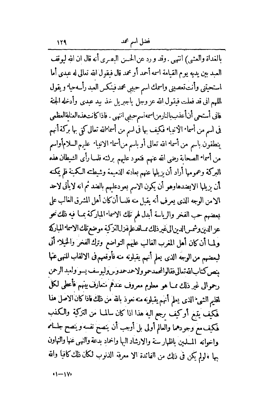 وَقَدْ وَرَدَ عَنْ الْحَسَنِ الْبَصْرِيِّ أَنَّهُ قَالَ: إنَّ اللَّهَ لَيُوقِفُ الْعَبْدَ بَيْنَ يَدَيْهِ يَوْمَ الْقِيَامَةِ اسْمُهُ أَحْمَدُ أَوْ مُحَمَّدٌ قَالَ فَيَقُولُ اللَّهُ تَعَالَى لَهُ: عَبْدِي أَمَا اسْتَحَيْتَ مِنِّي وَأَنْتَ تَعْصِينِي وَاسْمُك اسْمُ حَبِيبِي مُحَمَّدٍ فَيُنَكِّسُ الْعَبْدُ رَأْسَهُ حَيَاءً وَيَقُولُ: اللَّهُمَّ إنِّي قَدْ فَعَلْت فَيَقُولُ اللَّهُ عَزَّ وَجَلَّ يَا جِبْرِيلُ خُذْ بِيَدِ عَبْدِي وَأَدْخِلْهُ الْجَنَّةَ، فَإِنِّي أَسْتَحِي أَنْ أُعَذِّبَ بِالنَّارِ مَنْ اسْمُهُ اسْمُ حَبِيبِي. فَإِذَا كَانَتْ هَذِهِ الْعِنَايَةُ الْعُظْمَى فِي اسْمٍ مِنْ أَسْمَاءِ الْأَنْبِيَاءِ فَكَيْفَ بِهَا فِي اسْمٍ مِنْ أَسْمَاءِ اللَّهِ تَعَالَى كَفَى بِهَا بَرَكَةً أَنَّهُمْ يَنْطِقُونَ بِاسْمٍ مِنْ أَسْمَاءِ اللَّهِ تَعَالَى أَوْ بِاسْمٍ مِنْ أَسْمَاءِ الْأَنْبِيَاءِ - عَلَيْهِمْ السَّلَامُ - أَوْ اسْمٍ مِنْ أَسْمَاءِ الصَّحَابَةِ - رَضِيَ اللَّهُ عَنْهُمْ - فَتَعُودُ عَلَيْهِمْ بَرَكَتُهُ، فَلَمَّا رَأَى الشَّيْطَانُ هَذِهِ الْبَرَكَةَ وَعُمُومَهَا أَرَادَ أَنْ يُزِيلَهَا عَنْهُمْ بِعَادَتِهِ الذَّمِيمَةِ وَشَيْطَنَتِهِ الْكَمِينَةِ فَلَمْ يُمْكِنُهُ أَنْ يُزِيلَهَا إلَّا بِضِدِّهَا، وَهُوَ أَنْ يَكُونَ الِاسْمُ يَعُودُ عَلَيْهِمْ بِالضِّدِّ، ثُمَّ إنَّهُ لَا يَأْتِي لِأَحَدٍ إلَّا مِنْ الْوَجْهِ الَّذِي يَعْرِفُ أَنْ يُقْبَلَ مِنْهُ فَلَمَّا أَنْ كَانَ أَهْلُ الْمَشْرِقِ الْغَالِبُ عَلَى بَعْضِهِمْ حُبُّ الْفَخْرِ وَالرِّيَاسَةِ أَبْدَلَ لَهُمْ تِلْكَ الْأَسْمَاءَ الْمُبَارَكَةَ بِمَا فِيهِ ذَلِكَ نَحْوَ عِزِّ الدَّيْنِ وَشَمْسِ الدَّيْنِ إلَى غَيْرِ ذَلِكَ مِمَّا قَدْ عُلِمَ، فَنَزَّلَ التَّزْكِيَةَ مَوْضِعَ تِلْكَ الْأَسْمَاءِ الْمُبَارَكَةِ، وَلَمَّا أَنْ كَانَ أَهْلُ الْمَغْرِبِ الْغَالِبُ عَلَيْهِمْ التَّوَاضُعُ وَتَرْكُ الْفَخْرِ وَالْخُيَلَاءِ أَتَى لِبَعْضِهِمْ مِنْ الْوَجْهِ الَّذِي يَعْلَمُ أَنَّهُمْ يَقْبَلُونَهُ مِنْهُ فَأَوْقَعَهُمْ فِي الْأَلْقَابِ الْمَنْهِيِّ عَنْهَا بِنَصِّ كِتَابِ اللَّهِ تَعَالَى فَقَالُوا لِمُحَمَّدٍ حَمُّو، وَلِأَحْمَدَ حَمْدُوسٌ، وَلِيُوسُفَ يَسْوَ وَلِعَبْدِ الرَّحْمَن رَحْمُو إلَى غَيْرِ ذَلِكَ مِمَّا هُوَ مَعْلُومٌ مَعْرُوفٌ عِنْدَهُمْ مُتَعَارَفٌ بَيْنَهُمْ، فَأَعْطَى لِكُلِّ إقْلِيمٍ الشَّيْءَ الَّذِي يَعْلَمُ أَنَّهُمْ يَقْبَلُونَهُ مِنْهُ نَعُوذُ بِاَللَّهِ مِنْ ذَلِكَ فَإِذَا كَانَ الْأَصْلُ هَذَا فَكَيْفَ يُتَّبَعُ أَوْ كَيْفَ يُرْجَعُ إلَيْهِ هَذَا إذَا كَانَ سَالِمًا مِنْ التَّزْكِيَةِ وَالْكَذِبِ فَكَيْفَ مَعَ وُجُودِهِمَا وَالْعَالِمُ أَوْلَى بَلْ أَوْجَبُ أَنْ يَنْصَحَ نَفْسَهُ وَيَنْصَحَ جُلَسَاءَهُ وَإِخْوَانَهُ الْمُسْلِمِينَ بِإِظْهَارِ سُنَّةٍ وَالْإِرْشَادِ إلَيْهَا وَإِخْمَادِ بِدْعَةٍ وَالنَّهْيِ عَنْهَا وَالتَّهَاوُنِ بِهَا.