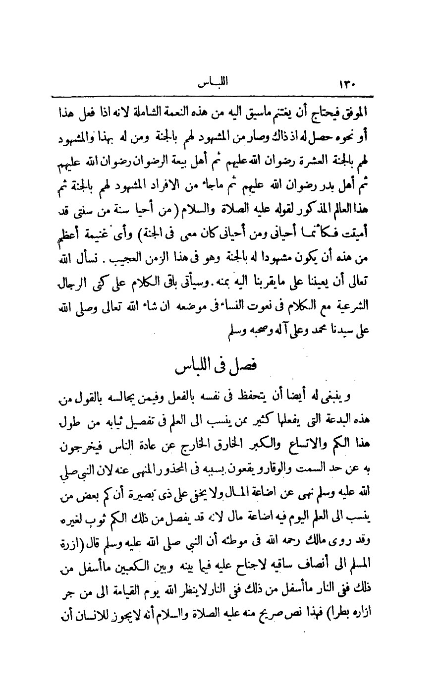 (فَصْلٌ) فِي اللِّبَاسِ وَيَنْبَغِي لَهُ أَيْضًا أَنْ يَتَحَفَّظَ فِي نَفْسِهِ بِالْفِعْلِ وَفِيمَنْ يُجَالِسُهُ بِالْقَوْلِ مِنْ هَذِهِ الْبِدْعَةِ الَّتِي يَفْعَلُهَا كَثِيرٌ مِمَّنْ يُنْسَبُ إلَى الْعِلْمِ فِي تَفْصِيلِ ثِيَابِهِ مِنْ طُولِ هَذَا الْكُمِّ وَالِاتِّسَاعِ وَالْكِبَرِ الْخَارِقِ الْخَارِجِ عَنْ عَادَةِ النَّاسِ، فَيَخْرُجُونَ بِهِ عَنْ حَدِّ السَّمْتِ وَالْوَقَارِ وَيَقَعُونَ بِسَبَبِهِ فِي الْمَحْذُورِ الْمَنْهِيِّ عَنْهُ؛ لِأَنَّ «النَّبِيَّ - صَلَّى اللَّهُ عَلَيْهِ وَسَلَّمَ - نَهَى عَنْ إضَاعَةِ الْمَالِ» وَلَا يَخْفَى عَلَى ذِي بَصِيرَةٍ أَنَّ كُمَّ بَعْضِ مَنْ يُنْسَبُ إلَى الْعِلْمِ الْيَوْمَ فِيهِ إضَاعَةُ مَالٍ؛ لِأَنَّهُ قَدْ يُفَصِّلُ مِنْ ذَلِكَ الْكُمِّ ثَوْبًا لِغَيْرِهِ، وَقَدْ رَوَى مَالِكٌ - رَحِمَهُ اللَّهُ - فِي مُوَطَّئِهِ أَنَّ النَّبِيَّ - صَلَّى اللَّهُ عَلَيْهِ وَسَلَّمَ - قَالَ «إزْرَةُ الْمُسْلِمِ إلَى أَنْصَافِ سَاقَيْهِ لَا جُنَاحَ عَلَيْهِ فِيمَا بَيْنَهُ وَبَيْنَ الْكَعْبَيْنِ مَا أَسْفَلَ مِنْ ذَلِكَ فَفِي النَّارِ مَا أَسْفَلَ مِنْ ذَلِكَ فَفِي النَّارِ لَا يَنْظُرُ اللَّهُ يَوْمَ الْقِيَامَةِ إلَى مَنْ جَرَّ إزَارَهُ بَطَرًا» فَهَذَا نَصٌّ صَرِيحٌ مِنْهُ - عَلَيْهِ الصَّلَاةُ وَالسَّلَامُ - أَنَّهُ لَا يَجُوزُ لِلْإِنْسَانِ أَنْ