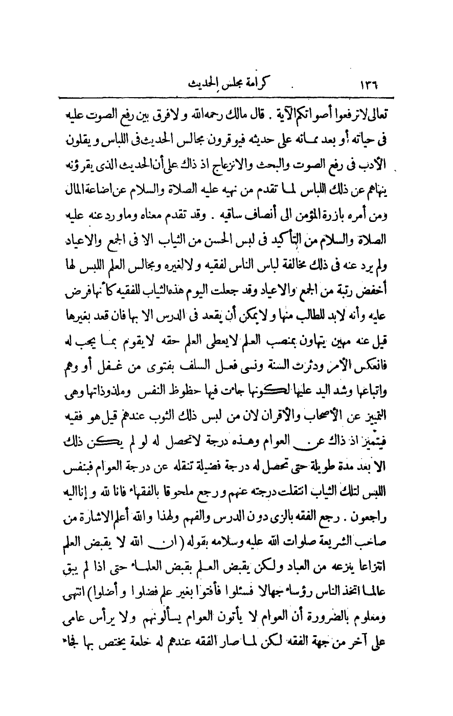 قَالَ مَالِكٌ - رَحِمَهُ اللَّهُ - وَلَا فَرْقَ بَيْنَ رَفْعِ الصَّوْتِ عَلَيْهِ فِي حَيَاتِهِ أَوْ بَعْدَ مَمَاتِهِ عَلَى حَدِيثِهِ، فَيُوَقِّرُونَ مَجَالِسَ الْحَدِيثِ فِي اللِّبَاسِ وَيُقِلُّونَ الْأَدَبَ فِي رَفْعِ الصَّوْتِ وَالْبَحْثِ وَالِانْزِعَاجِ إذْ ذَاكَ عَلَى أَنَّ الْحَدِيثَ الَّذِي يَقْرَؤُنَّهُ يَنْهَاهُمْ عَنْ ذَلِكَ اللِّبَاسِ لِمَا تَقَدَّمَ مِنْ «نَهْيِهِ - عَلَيْهِ الصَّلَاةُ وَالسَّلَامُ - عَنْ إضَاعَةِ الْمَالِ» ، وَمِنْ «أَمْرِهِ بِإِزْرَةِ الْمُؤْمِنِ إلَى أَنْصَافِ سَاقَيْهِ» .