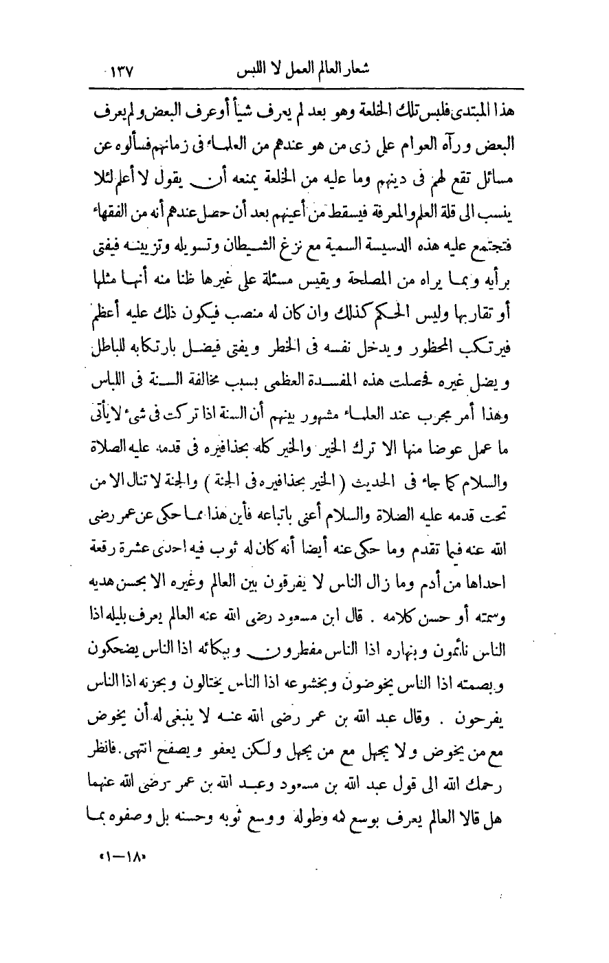 قَالَ ابْنُ مَسْعُودٍ: - رَضِيَ اللَّهُ عَنْهُ - الْعَالِمُ يُعْرَفُ بِلَيْلِهِ إذَا النَّاسُ نَائِمُونَ وَبِنَهَارِهِ إذَا النَّاسُ مُفْطِرُونَ وَبِبُكَائِهِ إذَا النَّاسُ يَضْحَكُونَ وَبِصَمْتِهِ إذَا النَّاسُ يَخُوضُونَ وَبِخُشُوعِهِ إذَا النَّاسُ يَخْتَالُونَ وَبِحُزْنِهِ إذَا النَّاسُ يَفْرَحُونَ. وَقَالَ عَبْدُ اللَّهِ بْنُ عُمَرَ: - رَضِيَ اللَّهُ عَنْهُ - لَا يَنْبَغِي لَهُ أَنْ يَخُوضَ مَعَ مَنْ يَخُوضُ وَلَا يَجْهَلَ مَعَ مَنْ يَجْهَلُ وَلَكِنْ يَعْفُو وَيُصْفَحُ انْتَهَى. فَانْظُرْ رَحِمَك اللَّهُ إلَى قَوْلِ عَبْدِ اللَّهِ بْنِ مَسْعُودٍ وَعَبْدِ اللَّهِ بْنِ عُمَرَ - رَضِيَ اللَّهُ عَنْهُمَا - هَلْ قَالَا الْعَالِمُ يُعْرَفُ بِوُسْعِ كُمِّهِ وَطُولِهِ وَوُسْعِ ثَوْبِهِ وَحُسْنِهِ بَلْ وَصَفُوهُ بِمَا