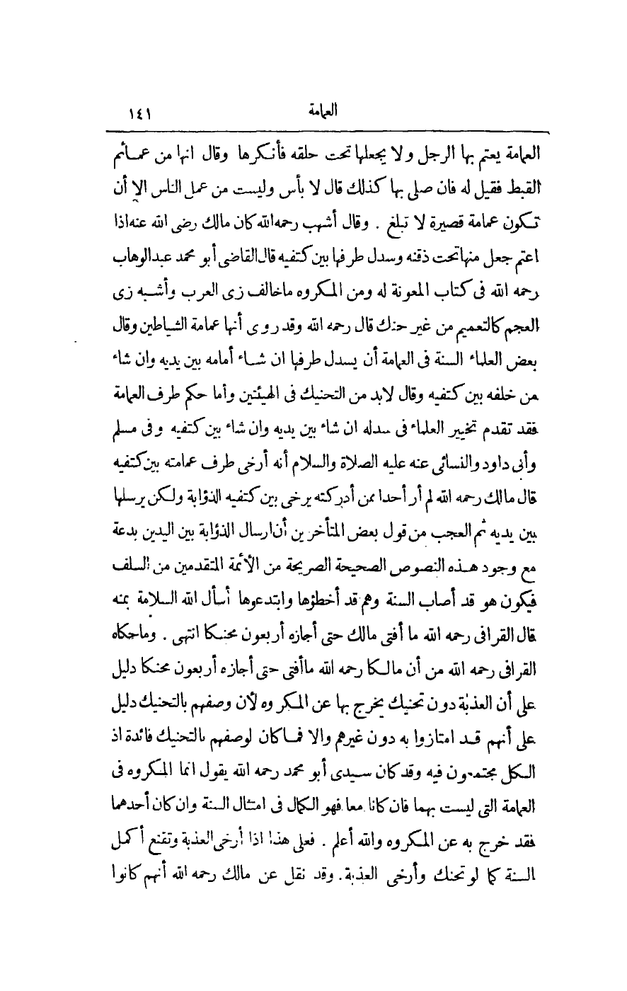 الْعِمَامَةِ يَعْتَمُّ بِهَا الرَّجُلُ، وَلَا يَجْعَلُهَا تَحْتَ حَلْقِهِ فَأَنْكَرَهَا وَقَالَ: إنَّهَا مِنْ عَمَائِمِ الْقِبْطِ فَقِيلَ لَهُ، فَإِنْ صَلَّى بِهَا كَذَلِكَ قَالَ: لَا بَأْسَ وَلَيْسَتْ مِنْ عَمَلِ النَّاسِ إلَّا أَنْ تَكُونَ عِمَامَةً قَصِيرَةً لَا تَبْلُغُ. وَقَالَ أَشْهَبُ: - رَحِمَهُ اللَّهُ - كَانَ مَالِكٌ - رَضِيَ اللَّهُ عَنْهُ - إذَا اعْتَمَّ جَعَلَ مِنْهَا تَحْتَ ذَقَنِهِ وَسَدَلَ طَرَفَهَا بَيْنَ كَتِفَيْهِ قَالَ الْقَاضِي أَبُو مُحَمَّدٍ عَبْدُ الْوَهَّابِ - رَحِمَهُ اللَّهُ - فِي كِتَابِ الْمَعُونَةِ لَهُ: وَمِنْ الْمَكْرُوهِ مَا خَالَفَ زِيَّ الْعَرَبِ وَأَشْبَهَ زِيَّ الْعَجَمِ كَالتَّعْمِيمِ مِنْ غَيْرِ حَنَكٍ قَالَ: - رَحِمَهُ اللَّهُ - وَقَدْ رُوِيَ أَنَّهَا عِمَامَةُ الشَّيَاطِينِ وَقَالَ بَعْضُ الْعُلَمَاءِ السُّنَّةُ فِي الْعِمَامَةِ أَنْ يُسْدِلَ طَرَفَهَا إنْ شَاءَ أَمَامَهُ بَيْنَ يَدَيْهِ وَإِنْ شَاءَ مِنْ خَلْفِهِ بَيْنَ كَتِفَيْهِ، وَقَالَ: لَا بُدَّ مِنْ التَّحْنِيكِ فِي الْهَيْئَتَيْنِ، وَأَمَّا حُكْمُ طَرَفِ الْعِمَامَةِ فَقَدْ تَقَدَّمَ تَخْيِيرُ الْعُلَمَاءِ فِي سَدْلِهِ إنْ شَاءَ بَيْنَ يَدَيْهِ، وَإِنْ شَاءَ بَيْنَ كَتِفَيْهِ، وَفِي مُسْلِمٍ وَأَبِي دَاوُد وَالنَّسَائِيِّ عَنْهُ «- عَلَيْهِ الصَّلَاةُ وَالسَّلَامُ - أَنَّهُ أَرْخَى طَرَفَ عِمَامَتِهِ بَيْنَ كَتِفَيْهِ» قَالَ مَالِكٌ - رَحِمَهُ اللَّهُ - لَمْ أَرَ أَحَدًا مِمَّنْ أَدْرَكْته يُرْخِي بَيْنَ كَتِفَيْهِ الذُّؤَابَةَ وَلَكِنْ يُرْسِلُهَا بَيْنَ يَدَيْهِ، ثُمَّ الْعَجَبُ مِنْ قَوْلِ بَعْضِ الْمُتَأَخِّرِينَ أَنَّ إرْسَالَ الذُّؤَابَةِ بَيْنَ الْيَدَيْنِ بِدْعَةٌ مَعَ وُجُودِ هَذِهِ النُّصُوصِ الصَّحِيحَةِ الصَّرِيحَةِ مِنْ الْأَئِمَّةِ الْمُتَقَدِّمِينَ مِنْ السَّلَفِ فَيَكُونُ هُوَ قَدْ أَصَابَ السُّنَّةَ وَهُمْ قَدْ أَخَطَؤُهَا وَابْتَدَعُوهَا أَسْأَلُ اللَّهَ السَّلَامَةَ بِمَنِّهِ قَالَ الْقَرَافِيُّ - رَحِمَهُ اللَّهُ - مَا أَفْتَى مَالِكٌ حَتَّى أَجَازَهُ أَرْبَعُونَ مُحَنَّكًا انْتَهَى.