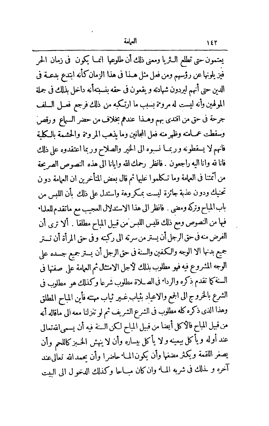 يَعْتَمُّونَ حَتَّى تَطْلُعَ الثُّرَيَّا وَمَعْنَى ذَلِكَ أَنَّ طُلُوعَهَا إنَّمَا يَكُونُ فِي زَمَانِ الْحَرِّ فَيُزِيلُونَهَا عَنْ رُءُوسِهِمْ، وَمَنْ فَعَلَ مِثْلَ هَذَا فِي هَذَا الزَّمَانِ كَأَنَّهُ ابْتَدَعَ بِدْعَةً فِي الدَّيْنِ حَتَّى أَنَّهُمْ لَيَرُدُّونَ شَهَادَتَهُ وَيَقَعُونَ فِي حَقِّهِ بِنِسْبَتِهِ أَنَّهُ دَاخِلٌ بِذَلِكَ فِي جُمْلَةِ الْمُوَلِّهِينَ وَأَنَّهُ لَيْسَتْ لَهُ مُرُوءَةٌ بِسَبَبِ مَا ارْتَكَبَهُ مِنْ ذَلِكَ فَرَجَعَ فِعْلُ السَّلَفِ جُرْحَةً فِي حَقِّ مَنْ اقْتَدَى بِهِمْ، وَهَذَا عِنْدَهُمْ بِخِلَافِ مَنْ حَضَرَ السَّمَاعَ وَرَقَصَ وَسَقَطَتْ عِمَامَتُهُ وَظَهَرَ مِنْهُ فِعْلُ الْمَجَانِينِ، وَمَا يُذْهِبُ الْمُرُوءَةَ وَالْحِشْمَةَ بِالْكُلِّيَّةِ فَإِنَّهُمْ لَا يُسْقِطُونَهُ وَرُبَّمَا نَسَبُوهُ إلَى الْخَيْرِ وَالصَّلَاحِ وَرُبَّمَا اعْتَقَدُوهُ عَلَى ذَلِكَ، فَإِنَّا لِلَّهِ وَإِنَّا إلَيْهِ رَاجِعُونَ. فَانْظُرْ رَحِمَك اللَّهُ وَإِيَّانَا إلَى هَذِهِ النُّصُوصِ الصَّرِيحَةِ مِنْ أَئِمَّتِنَا فِي الْعِمَامَةِ وَمَا تَكَلَّمُوا عَلَيْهَا، ثُمَّ قَالَ بَعْضُ الْمُتَأَخِّرِينَ: إنَّ الْعِمَامَةَ دُونَ تَحْنِيكٍ وَدُونَ عَذْبَةٍ جَائِزَةٌ لَيْسَتْ بِمَكْرُوهَةٍ وَاسْتَدَلَّ عَلَى ذَلِكَ بِأَنَّ اللُّبْسَ مِنْ بَابِ الْمُبَاحِ وَتَرَكَهُ وَمَضَى.