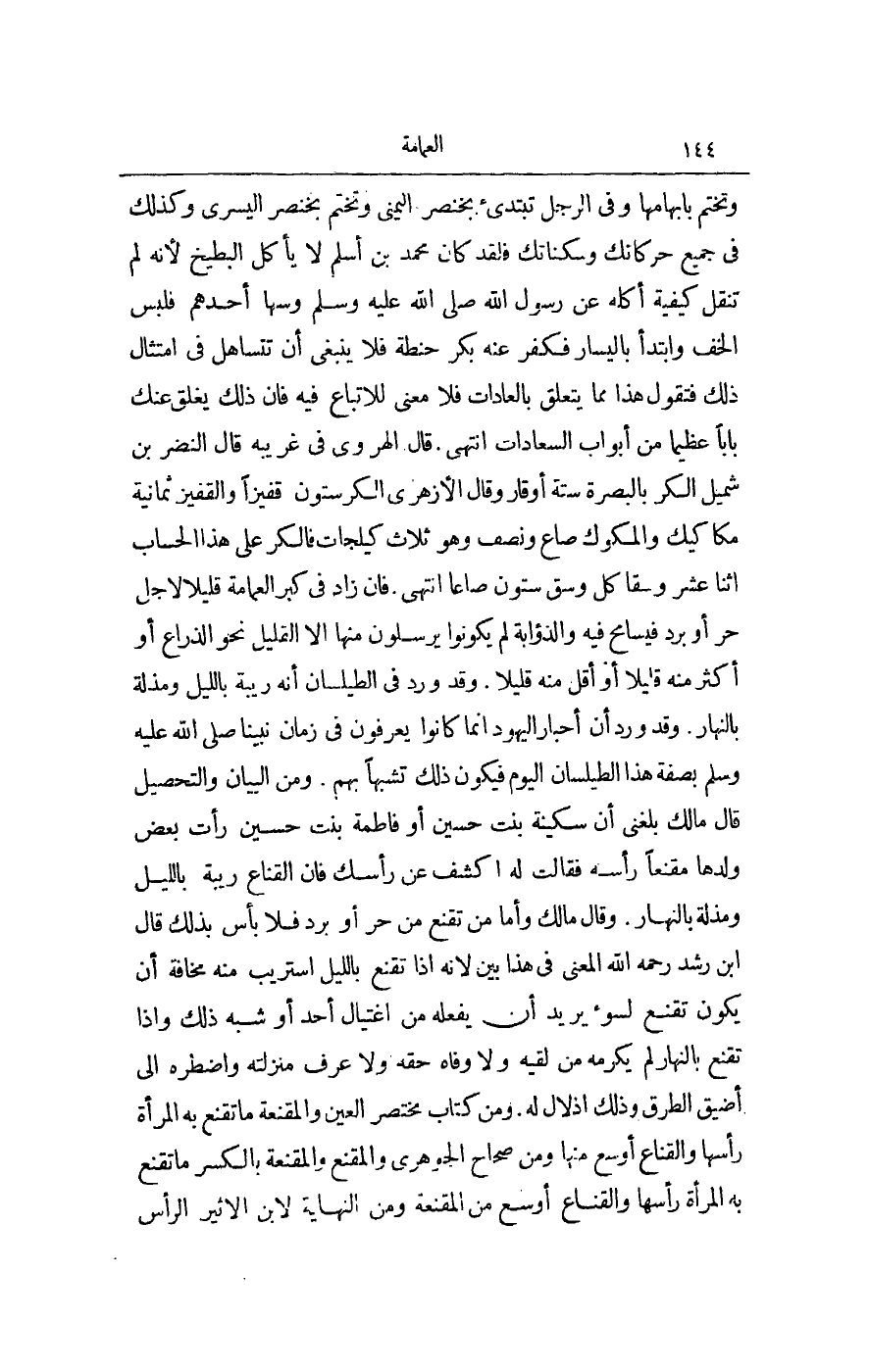 وَتَخْتِمَ بِإِبْهَامِهَا، وَفِي الرِّجْلِ تَبْتَدِئُ بِخِنْصَرِ الْيُمْنَى وَتَخْتِمُ بِخِنْصَرِ الْيُسْرَى، وَكَذَلِكَ فِي جَمِيعِ حَرَكَاتِك وَسَكَنَاتِك فَلَقَدْ كَانَ مُحَمَّدُ بْنُ أَسْلَمَ لَا يَأْكُلُ الْبِطِّيخَ؛ لِأَنَّهُ لَمْ تُنْقَلُ كَيْفِيَّةُ أَكْلِهِ عَنْ رَسُولِ اللَّهِ - صَلَّى اللَّهُ عَلَيْهِ وَسَلَّمَ - وَسَهَا أَحَدُهُمْ فَلَبِسَ الْخُفَّ وَابْتَدَأَ بِالْيَسَارِ فَكَفَّرَ عَنْهُ بِكُرِّ حِنْطَةٍ فَلَا يَنْبَغِي أَنْ تَتَسَاهَلَ فِي امْتِثَالِ ذَلِكَ فَتَقُولُ: هَذَا مِمَّا يَتَعَلَّقُ بِالْعَادَاتِ فَلَا مَعْنَى لِلِاتِّبَاعِ فِيهِ، فَإِنَّ ذَلِكَ يَغْلِقُ عَنْك بَابًا عَظِيمًا مِنْ أَبْوَابِ السَّعَادَاتِ انْتَهَى. قَالَ الْهَرَوِيُّ فِي غَرِيبِهِ قَالَ النَّضْرُ بْنُ شُمَيْلٍ الْكُرُّ بِالْبَصْرَةِ سِتَّةُ أَوْقَارٍ وَقَالَ الْأَزْهَرِيُّ: الْكُرُّ سِتُّونَ قَفِيزًا وَالْقَفِيزُ ثَمَانِيَةُ مَكَاكِيكَ وَالْمَكُّوكُ صَاعٌ وَنِصْفُ، وَهُوَ ثَلَاثُ كِيلَجَاتٍ، فَالْكُرُّ عَلَى هَذَا الْحِسَابِ اثْنَا عَشْرَ وَسْقًا كُلُّ وَسْقٍ سِتُّونَ صَاعًا انْتَهَى. فَإِنْ زَادَ فِي كِبَرِ الْعِمَامَةِ قَلِيلًا لِأَجْلِ حَرٍّ أَوْ بَرْدٍ فَيُسَامَحُ فِيهِ، وَالذُّؤَابَةُ لَمْ يَكُونُوا يُرْسِلُونَ مِنْهَا إلَّا الْقَلِيلَ نَحْوَ الذِّرَاعِ أَوْ أَكْثَرَ مِنْهُ قَلِيلًا أَوْ أَقَلَّ مِنْهُ قَلِيلًا.