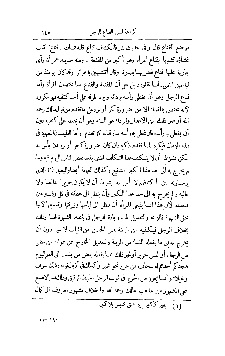 وَأَمَّا الطَّيْلَسَانُ الْمَعْهُودُ فِي هَذَا الزَّمَانِ فَيُكْرَهُ لِمَا تَقَدَّمَ ذِكْرُهُ، فَإِنْ كَانَ لِضَرُورَةٍ كَحَرٍّ أَوْ بَرْدٍ فَلَا بَأْسَ بِهِ لَكِنْ بِشَرْطِ أَنْ لَا يَتَكَلَّفَ هَذَا التَّكَلُّفَ الَّذِي يَفْعَلُهُ بَعْضُ النَّاسِ الْيَوْمَ فِيهِ وَمَا لَمْ يَخْرُجُ بِهِ إلَى حَدِّ هَذَا الْكِبَرِ الشَّنِيعِ، وَكَذَلِكَ الْعِمَامَةُ أَيْضًا وَالْبَقْيَارُ الَّذِي يُرْسِلُونَهُ بَيْنَ أَكْتَافِهِمْ لَا بَأْسَ بِهِ بِشَرْطِ أَنْ لَا يَكُونَ حَرِيرًا خَالِصًا، وَلَا غَالِبُهُ وَلَمْ يَخْرُجْ بِهِ إلَى حَدِّ هَذَا الْكِبَرِ وَأَنْ يَنْظُرَ إلَى عِطْفِهِ فِي كُلِّ وَقْتٍ وَحِينٍ فَيَعْدِلُهُ؛ لِأَنَّ هَذَا إنَّمَا يَنْبَغِي لِلْمَرْأَةِ أَنْ تَنْظُرَ إلَى لِبَاسِهَا وَزِينَتِهَا وَتَعْدِيلِهَا؛ لِأَنَّهَا مَحَلُّ الشَّهْوَةِ فَالزِّينَةُ وَالتَّعْدِيلُ لَهَا زِيَادَةٌ لِلرَّجُلِ فِي بَاعِثِ الشَّهْوَةِ لَهَا، وَذَلِكَ بِخِلَافِ الرَّجُلِ فَيَكْفِيهِ مِنْ الزِّينَةِ لُبْسُ الْحَسَنِ مِنْ الثِّيَابِ لَا غَيْرُ دُونَ أَنْ يَخْرُجَ بِهِ إلَى مَا يَفْعَلُهُ النِّسَاءُ مِنْ الزِّينَةِ وَالتَّعْدِيلِ الْخَارِجِ عَنْ عَوَائِدِ مَنْ مَضَى مِنْ الرِّجَالِ أَوْ لُبْسِ حَرِيرٍ أَوْ غَيْرِ ذَلِكَ مِمَّا يَفْعَلُهُ بَعْضُ مَنْ يُنْسَبُ إلَى الْعِلْمِ الْيَوْمَ، فَتَجِدُ كُمَّ أَحَدِهِمْ لَهُ سِجَافٌ مِنْ حَرِيرٍ نَحْوُ شِبْرٍ، وَكَذَلِكَ فِي أَذْيَالِ ثَوْبِهِ وَذَلِكَ شَرَفٌ وَخُيَلَاءُ، وَإِنَّمَا يَجُوزُ مِنْ الْحَرِيرِ فِي ثَوْبِ الرَّجُلِ الْخَيْطُ الرَّقِيقُ وَذَلِكَ قَدْرُ الْأُصْبُعِ عَلَى الْمَشْهُورِ مِنْ مَذْهَبِ مَالِكٍ - رَحِمَهُ اللَّهُ -، وَالْخِلَافُ مَشْهُورٌ مَعْرُوفٌ إلَى كَمَالِ