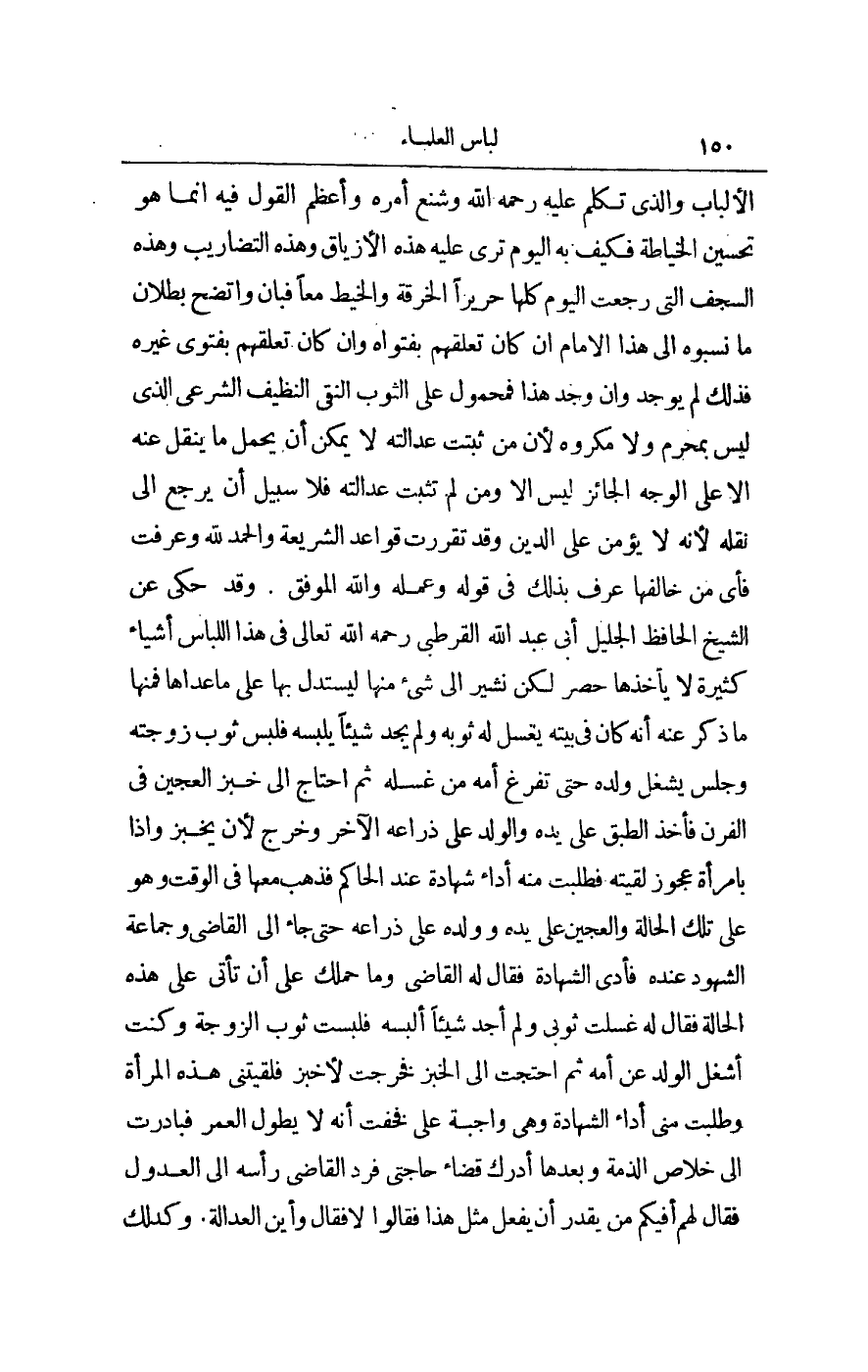 وَقَدْ حُكِيَ عَنْ الشَّيْخِ الْحَافِظِ الْجَلِيلِ أَبِي عَبْدِ اللَّهِ الْقُرْطُبِيُّ - رَحِمَهُ اللَّهُ تَعَالَى - فِي هَذَا اللِّبَاسِ أَشْيَاءُ كَثِيرَةٌ لَا يَأْخُذُهَا حَصْرٌ لَكِنْ نُشِيرُ إلَى شَيْءٍ مِنْهَا لِيُسْتَدَلَّ بِهَا عَلَى مَا عَدَاهَا، فَمِنْهَا مَا ذُكِرَ عَنْهُ أَنَّهُ كَانَ فِي بَيْتِهِ يُغْسَلُ لَهُ ثَوْبُهُ وَلَمْ يَجِدْ شَيْئًا يَلْبَسُهُ فَلَبِسَ ثَوْبَ زَوْجَتِهِ وَجَلَسَ يَشْغَلُ وَلَدَهُ حَتَّى تَفْرُغَ أُمُّهُ مِنْ غَسْلِهِ، ثُمَّ احْتَاجَ إلَى خَبْزِ الْعَجِينِ فِي الْفُرْنِ فَأَخَذَ الطَّبَقَ عَلَى يَدِهِ وَالْوَلَدَ عَلَى ذِرَاعِهِ الْآخَرِ وَخَرَجَ لَأَنْ يَخْبِزَ، وَإِذَا بِامْرَأَةٍ عَجُوزٍ لَقِيَتْهُ فَطَلَبَتْ مِنْهُ أَدَاءَ شَهَادَةٍ عِنْدَ الْحَاكِمِ فَذَهَبَ مَعَهَا فِي الْوَقْتِ، وَهُوَ عَلَى تِلْكَ الْحَالَةِ وَالْعَجِينُ عَلَى يَدِهِ وَوَلَدُهُ عَلَى ذِرَاعِهِ حَتَّى جَاءَ إلَى الْقَاضِي وَجَمَاعَةُ الشُّهُودِ عِنْدَهُ فَأَدَّى الشَّهَادَةَ فَقَالَ لَهُ الْقَاضِي: وَمَا حَمَلَك عَلَى أَنْ تَأْتِيَ عَلَى هَذِهِ الْحَالَةِ فَقَالَ لَهُ: غَسَلْت ثَوْبِي وَلَمْ أَجِدْ شَيْئًا أَلْبَسُهُ فَلَبِسْت ثَوْبَ الزَّوْجَةِ وَكُنْت أَشْغَلُ الْوَلَدَ عَنْ أُمِّهِ، ثُمَّ احْتَجْتُ إلَى الْخُبْزِ فَخَرَجَتْ لِأَخْبِزَ فَلَقِيَتْنِي هَذِهِ الْمَرْأَةُ وَطَلَبَتْ مِنِّي أَدَاءَ الشَّهَادَةِ، وَهِيَ وَاجِبَةٌ عَلَيَّ فَخِفْت أَنَّهُ لَا يَطُولُ الْعُمُرُ فَبَادَرْت إلَى خَلَاصِ الذِّمَّةِ، وَبَعْدَهَا أُدْرِكُ قَضَاءَ حَاجَتِي فَرَدَّ الْقَاضِي رَأْسَهُ إلَى الْعُدُولِ فَقَالَ لَهُمْ: أَفِيكُمْ مَنْ يَقْدِرُ أَنْ يَفْعَلَ مِثْلَ هَذَا فَقَالُوا: لَا فَقَالَ: وَأَيْنَ الْعَدَالَةُ. وَكَذَلِكَ