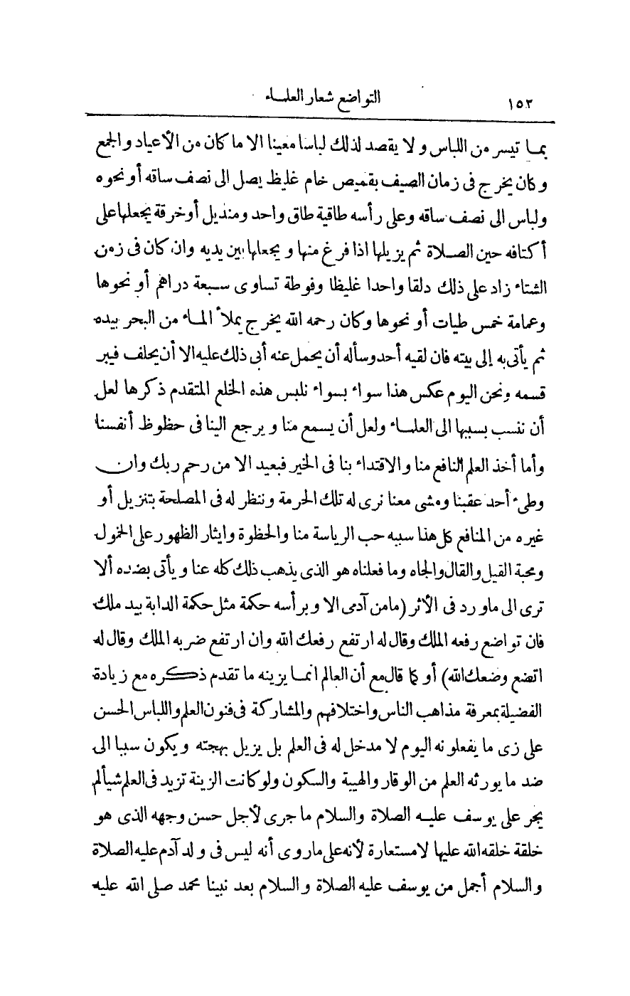 أَوْ كَمَا قَالَ مَعَ أَنَّ الْعَالِمَ إنَّمَا يُزَيِّنُهُ مَا تَقَدَّمَ ذِكْرُهُ مَعَ زِيَادَةِ الْفَضِيلَةِ بِمَعْرِفَةِ مَذَاهِبِ النَّاسِ وَاخْتِلَافِهِمْ وَالْمُشَارَكَةِ فِي فُنُونِ الْعِلْمِ وَاللِّبَاسِ الْحَسَنِ عَلَى زِيِّ مَا يَفْعَلُونَهُ الْيَوْمَ لَا مَدْخَلَ لَهُ فِي الْعِلْمِ بَلْ يُزِيلُ بَهْجَتَهُ وَيَكُونُ سَبَبًا إلَى ضِدِّ مَا يُوَرِّثُهُ الْعِلْمُ مِنْ الْوَقَارِ وَالْهَيْبَةِ وَالسُّكُونِ، وَلَوْ كَانَتْ الزِّينَةُ تَزِيدُ فِي الْعِلْمِ شَيْئًا لَمْ يَجْرِ عَلَى يُوسُفَ - عَلَيْهِ الصَّلَاةُ وَالسَّلَامُ - مَا جَرَى لِأَجْلِ حُسْنِ وَجْهِهِ الَّذِي هُوَ خِلْقَةٌ خَلَقَهُ اللَّهُ عَلَيْهَا لَا مُسْتَعَارَةٌ؛ لِأَنَّهُ عَلَى مَا رُوِيَ أَنَّهُ لَيْسَ فِي وَلَدِ آدَمَ - عَلَيْهِ الصَّلَاةُ وَالسَّلَامُ - أَجْمَلُ مِنْ يُوسُفَ - عَلَيْهِ الصَّلَاةُ وَالسَّلَامُ - بَعْدَ نَبِيِّنَا مُحَمَّدٍ - صَلَّى اللَّهُ عَلَيْهِ وَسَلَّمَ -