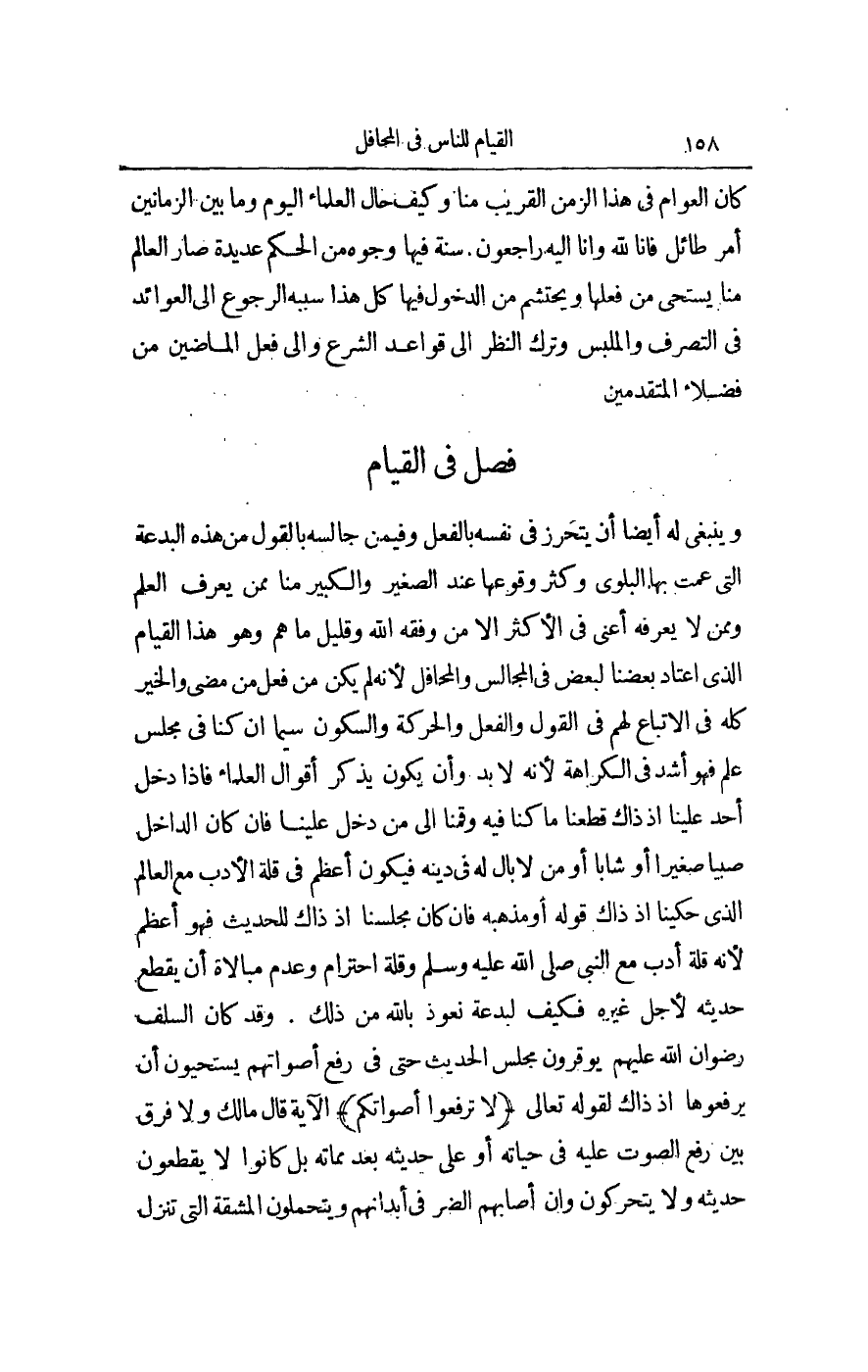 (فَصْلٌ) فِي الْقِيَامِ وَيَنْبَغِي لَهُ أَيْضًا أَنْ يَتَحَرَّزَ فِي نَفْسِهِ بِالْفِعْلِ وَفِيمَنْ جَالَسَهُ بِالْقَوْلِ مِنْ هَذِهِ الْبِدْعَةِ الَّتِي عَمَّتْ بِهَا الْبَلْوَى وَكَثُرَ وُقُوعُهَا عِنْدَ الصَّغِيرِ وَالْكَبِيرِ مِنَّا مِمَّنْ يَعْرِفُ الْعِلْمَ وَمِمَّنْ لَا يَعْرِفُهُ أَعْنِي فِي الْأَكْثَرِ إلَّا مَنْ وَفَّقَهُ اللَّهُ وَقَلِيلٌ مَا هُمْ، وَهُوَ هَذَا الْقِيَامُ الَّذِي اعْتَادَ بَعْضُنَا لِبَعْضٍ فِي الْمَجَالِسِ وَالْمَحَافِلِ؛ لِأَنَّهُ لَمْ يَكُنْ مِنْ فِعْلِ مَنْ مَضَى وَالْخَيْرُ كُلُّهُ فِي الِاتِّبَاعِ لَهُمْ فِي الْقَوْلِ وَالْفِعْلِ وَالْحَرَكَةِ وَالسُّكُونِ سِيَّمَا إنْ كُنَّا فِي مَجْلِسِ عِلْمٍ فَهُوَ أَشَدُّ فِي الْكَرَاهَةِ؛ لِأَنَّهُ لَا بُدَّ وَأَنْ يَكُونَ يَذْكُرُ أَقْوَالَ الْعُلَمَاءِ فَإِذَا دَخَلَ أَحَدٌ عَلَيْنَا إذْ ذَاكَ قَطَعْنَا مَا كُنَّا فِيهِ وَقُمْنَا إلَى مَنْ دَخَلَ عَلَيْنَا، فَإِنْ كَانَ الدَّاخِلُ صَبِيًّا صَغِيرًا أَوْ شَابًّا أَوْ مَنْ لَا بَالَ لَهُ فِي دِينِهِ فَيَكُونُ أَعْظَمَ فِي قِلَّةِ الْأَدَبِ مَعَ الْعَالِمِ الَّذِي حَكَيْنَا إذْ ذَاكَ قَوْلَهُ أَوْ مَذْهَبَهُ، فَإِنْ كَانَ مَجْلِسُنَا إذْ ذَاكَ لِلْحَدِيثِ فَهُوَ أَعْظَمُ؛ لِأَنَّهُ قِلَّةُ أَدَبٍ مَعَ النَّبِيِّ - صَلَّى اللَّهُ عَلَيْهِ وَسَلَّمَ - وَقِلَّةُ احْتِرَامٍ وَعَدَمُ مُبَالَاةٍ أَنْ يُقْطَعَ حَدِيثُهُ لِأَجْلِ غَيْرِهِ فَكَيْفَ لِبِدْعَةٍ نَعُوذُ بِاَللَّهِ مِنْ ذَلِكَ.