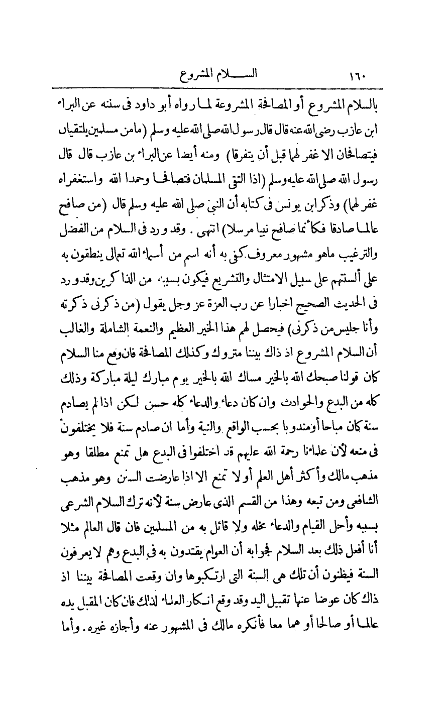 بِالسَّلَامِ الْمَشْرُوعِ أَوْ الْمُصَافَحَةِ الْمَشْرُوعَةِ لِمَا رَوَاهُ أَبُو دَاوُد فِي سُنَنِهِ عَنْ الْبَرَاءِ بْنِ عَازِبٍ - رَضِيَ اللَّهُ عَنْهُ - قَالَ: قَالَ رَسُولُ اللَّهِ - صَلَّى اللَّهُ عَلَيْهِ وَسَلَّمَ - «مَا مِنْ مُسْلِمَيْنِ يَلْتَقِيَانِ فَيَتَصَافَحَانِ إلَّا غُفِرَ لَهُمَا قَبْلَ أَنْ يَتَفَرَّقَا» . وَمِنْهُ أَيْضًا عَنْ الْبَرَاءِ بْنِ عَازِبٍ قَالَ: قَالَ رَسُولُ اللَّهِ - صَلَّى اللَّهُ عَلَيْهِ وَسَلَّمَ - «إذَا الْتَقَى الْمُسْلِمَانِ فَتَصَافَحَا وَحَمِدَا اللَّهَ وَاسْتَغْفَرَاهُ غُفِرَ لَهُمَا» وَذَكَرَ ابْنُ يُونُسَ فِي كِتَابِهِ أَنَّ النَّبِيَّ - صَلَّى اللَّهُ عَلَيْهِ وَسَلَّمَ - قَالَ «مَنْ صَافَحَ عَالِمًا صَادِقًا فَكَأَنَّمَا صَافَحَ نَبِيًّا مُرْسَلًا» انْتَهَى.