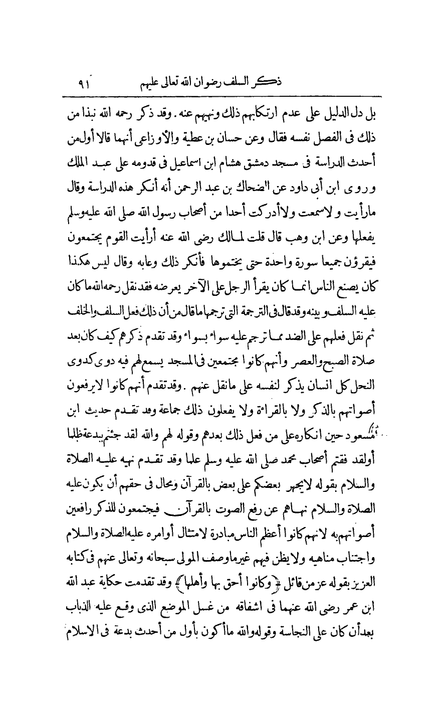 وَقَدْ تَقَدَّمَ أَنَّهُمْ كَانُوا لَا يَرْفَعُونَ أَصْوَاتَهُمْ بِالذِّكْرِ وَلَا بِالْقِرَاءَةِ وَلَا يَفْعَلُونَ ذَلِكَ جَمَاعَةً، وَقَدْ تَقَدَّمَ حَدِيثُ ابْنِ مَسْعُودٍ إنْكَارُهُ عَلَى مَنْ فَعَلَ ذَلِكَ بَعْدَهُمْ وَقَوْلُهُ لَهُمْ: وَاَللَّهِ لَقَدْ جِئْتُمْ بِبِدْعَةٍ ظُلْمًا أَوْ لَقَدْ فُقْتُمْ أَصْحَابَ مُحَمَّدٍ - صَلَّى اللَّهُ عَلَيْهِ وَسَلَّمَ - عِلْمًا، وَقَدْ تَقَدَّمَ نَهْيُهُ - عَلَيْهِ الصَّلَاةُ وَالسَّلَامُ - بِقَوْلِهِ: «لَا يَجْهَرْ بَعْضُكُمْ عَلَى بَعْضٍ بِالْقُرْآنِ وَمُحَالٌ فِي حَقِّهِمْ أَنْ يَكُونَ» - عَلَيْهِ الصَّلَاةُ وَالسَّلَامُ - نَهَاهُمْ عَنْ رَفْعِ الصَّوْتِ بِالْقُرْآنِ فَيَجْتَمِعُونَ لِلذِّكْرِ رَافِعِينَ أَصْوَاتَهُمْ بِهِ؛ لِأَنَّهُمْ كَانُوا أَعْظَمَ النَّاسِ مُبَادَرَةً لِامْتِثَالِ أَوَامِرِهِ - عَلَيْهِ الصَّلَاةُ وَالسَّلَامُ - وَاجْتِنَابِ مَنَاهِيهِ وَلَا يُظَنُّ فِيهِمْ غَيْرُ مَا وَصَفَ الْمَوْلَى سُبْحَانَهُ وَتَعَالَى عَنْهُمْ فِي كِتَابِهِ الْعَزِيزِ بِقَوْلِهِ عَزَّ مَنْ قَائِلٍ {وَكَانُوا أَحَقَّ بِهَا وَأَهْلَهَا} [الفتح: 26] ، وَقَدْ تَقَدَّمَتْ حِكَايَةُ عَبْدِ اللَّهِ بْنِ عُمَرَ - رَضِيَ اللَّهُ عَنْهُمَا - فِي إشْفَاقِهِ مِنْ غَسْلِ الْمَوْضِعِ الَّذِي وَقَعَ عَلَيْهِ الذُّبَابُ بَعْدَ أَنْ كَانَ عَلَى النَّجَاسَةِ، وَقَوْلُهُ: وَاَللَّهِ مَا أَكُونُ بِأَوَّلِ مَنْ أَحْدَثَ بِدْعَةً فِي الْإِسْلَامِ