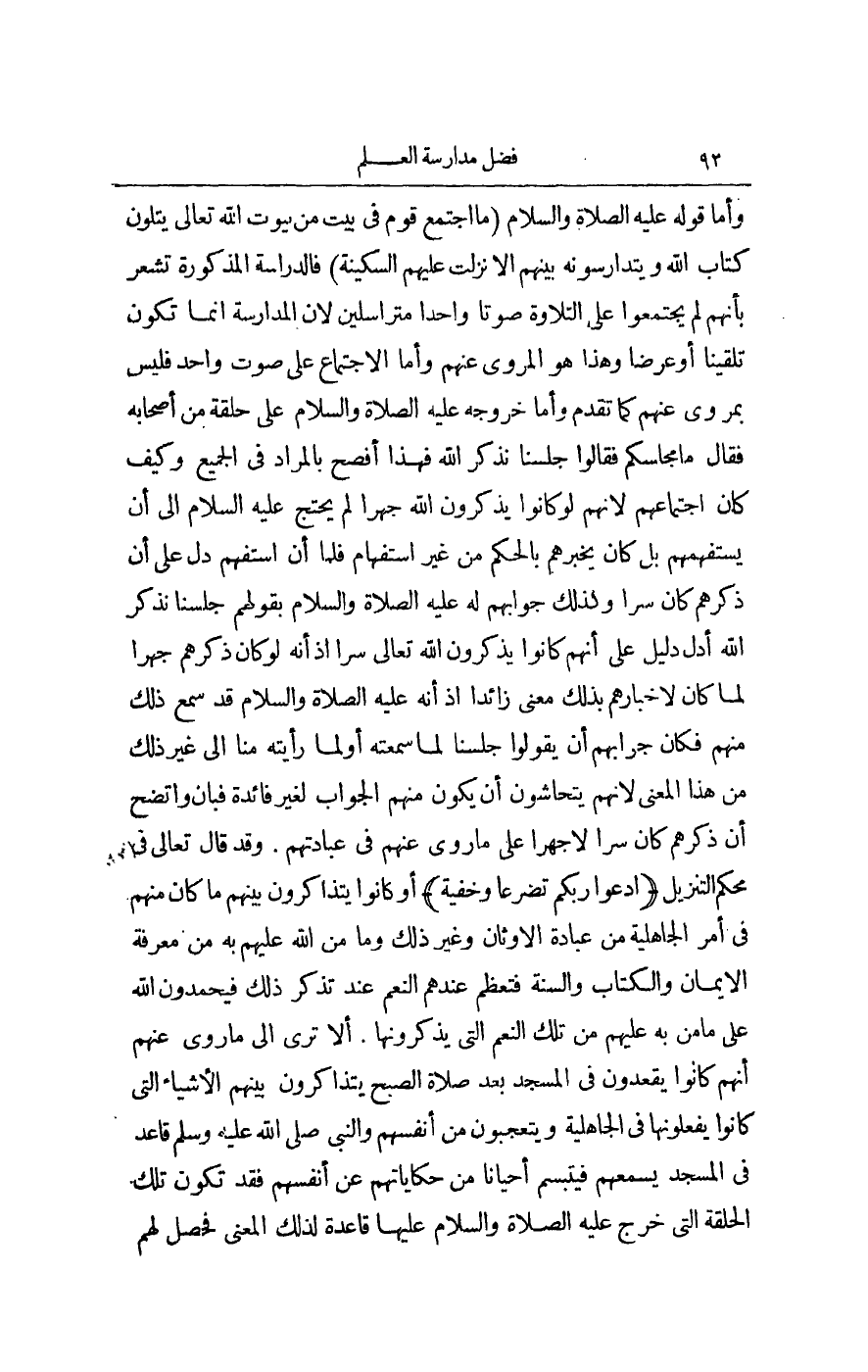 أَمَّا قَوْلُهُ: - عَلَيْهِ الصَّلَاةُ وَالسَّلَامُ - «مَا اجْتَمَعَ قَوْمٌ فِي بَيْتٍ مِنْ بُيُوتِ اللَّهِ تَعَالَى يَتْلُونَ كِتَابَ اللَّهِ وَيَتَدَارَسُونَهُ بَيْنَهُمْ إلَّا نَزَلَتْ عَلَيْهِمْ السَّكِينَةُ» .