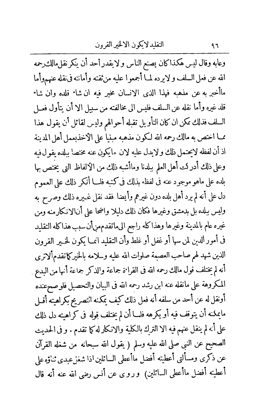 وَهَذَا كُلُّهُ رَاجِعٌ إلَى مَا تَقَدَّمَ مِنْ أَنَّ سَبَبَ هَذَا كُلِّهِ التَّقْلِيدُ فِي أُمُورِ الدِّينِ لِمَنْ سَهَا أَوْ غَفَلَ أَوْ غَلِطَ، وَأَنَّ التَّقْلِيدَ إنَّمَا يَكُونُ لِخَيْرِ الْقُرُونِ الَّذِينَ شَهِدَ لَهُمْ صَاحِبُ الْعِصْمَةِ صَلَوَاتُ اللَّهِ عَلَيْهِ وَسَلَامُهُ بِالْخَيْرِ كَمَا تَقَدَّمَ أَلَا تَرَى أَنَّهُ لَمْ يَخْتَلِفْ قَوْلُ مَالِكٍ - رَحِمَهُ اللَّهُ - فِي الْقِرَاءَةِ جَمَاعَةً وَالذِّكْرِ جَمَاعَةً أَنَّهَا مِنْ الْبِدَعِ الْمَكْرُوهَةِ عَلَى مَا نَقَلَهُ عَنْهُ ابْنُ رُشْدٍ - رَحِمَهُ اللَّهُ - فِي الْبَيَانِ وَالتَّحْصِيلِ فَلَوْ صَحَّ عِنْدَهُ أَوْ نَقَلَ لَهُ عَنْ أَحَدٍ مِنْ سَلَفِهِ أَنَّهُ فَعَلَ ذَلِكَ كَيْفَ يُمْكِنُهُ التَّصْرِيحُ بِكَرَاهِيَتِهِ؟ أَقَلُّ مَا يُمْكِنُهُ أَنْ يَتَوَقَّفَ فِيهِ أَوْ يَكْرَهَهُ فَلَمَّا أَنْ لَمْ يَخْتَلِفْ قَوْلُهُ فِي كَرَاهِيَتِهِ دَلَّ ذَلِكَ عَلَى أَنَّهُ لَمْ يَنْقُلْ عَنْهُمْ فِيهِ إلَّا التَّرْكَ بِالْكُلِّيَّةِ وَالْإِنْكَارَ لَهُ كَمَا تَقَدَّمَ.