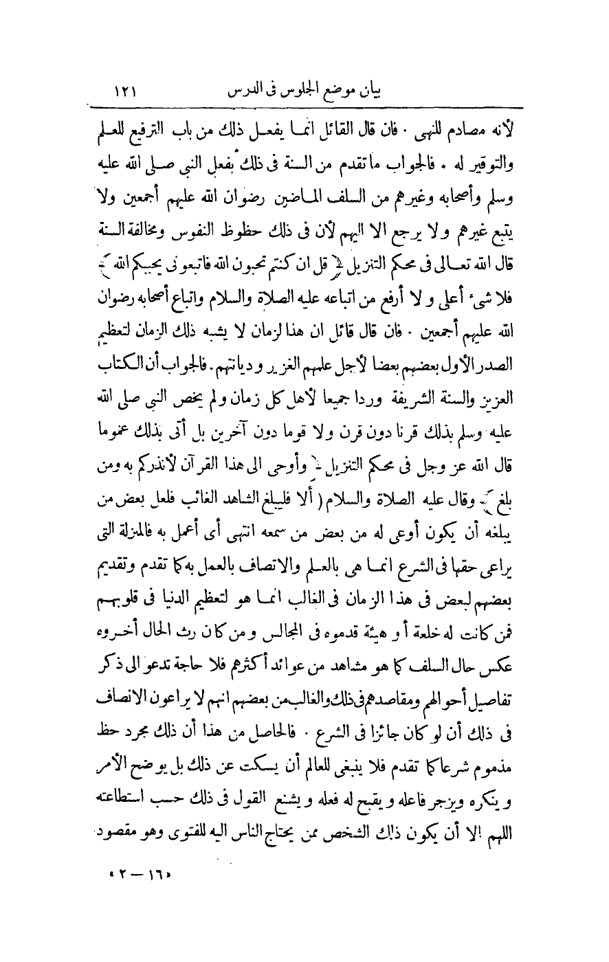 فَإِنْ قَالَ الْقَائِلُ: إنَّمَا يُفْعَلُ ذَلِكَ مِنْ بَابِ التَّرْفِيعِ لِلْعِلْمِ وَالتَّوْقِيرِ لَهُ. فَالْجَوَابُ مَا تَقَدَّمَ مِنْ السُّنَّةِ فِي ذَلِكَ بِفِعْلِ النَّبِيِّ - صَلَّى اللَّهُ عَلَيْهِ وَسَلَّمَ - وَأَصْحَابِهِ وَغَيْرِهِمْ مِنْ السَّلَفِ الْمَاضِينَ - رِضْوَانُ اللَّهِ عَلَيْهِمْ أَجْمَعِينَ -، وَلَا يُتَّبَعُ غَيْرُهُمْ وَلَا يُرْجَعُ إلَّا إلَيْهِمْ؛ لِأَنَّ فِي ذَلِكَ حُظُوظَ النُّفُوسِ وَمُخَالَفَةَ السُّنَّةِ، قَالَ اللَّهُ تَعَالَى فِي مُحْكَمِ التَّنْزِيلِ {قُلْ إِنْ كُنْتُمْ تُحِبُّونَ اللَّهَ فَاتَّبِعُونِي يُحْبِبْكُمُ اللَّهُ} [آل عمران: 31] فَلَا شَيْءَ أَعْلَى وَلَا أَرْفَعَ مِنْ اتِّبَاعِهِ - عَلَيْهِ الصَّلَاةُ وَالسَّلَامُ - وَاتِّبَاعِ أَصْحَابِهِ - رِضْوَانُ اللَّهِ عَلَيْهِمْ أَجْمَعِينَ -. فَإِنْ قَالَ قَائِلٌ: إنَّ هَذَا لَزَمَانٌ لَا يُشْبِهُ ذَلِكَ الزَّمَانَ لِتَعْظِيمِ الصَّدْرِ الْأَوَّلِ بَعْضِهِمْ بَعْضًا لِأَجْلِ عِلْمِهِمْ الْغَزِيرِ وَدِيَانَتِهِمْ. فَالْجَوَابُ: أَنَّ الْكِتَابَ الْعَزِيزَ وَالسُّنَّةَ الشَّرِيفَةَ وَرَدَا جَمِيعًا لِأَهْلِ كُلِّ زَمَانٍ، وَلَمْ يَخُصَّ النَّبِيُّ - صَلَّى اللَّهُ عَلَيْهِ وَسَلَّمَ - بِذَلِكَ قَرْنًا دُونَ قَرْنٍ وَلَا قَوْمًا دُونَ آخَرِينَ، بَلْ أَتَى بِذَلِكَ عُمُومًا قَالَ اللَّهُ عَزَّ وَجَلَّ فِي مُحْكَمِ التَّنْزِيلِ: {وَأُوحِيَ إِلَيَّ هَذَا الْقُرْآنُ لأُنْذِرَكُمْ بِهِ وَمَنْ بَلَغَ} [الأنعام: 19] ، وَقَالَ: - عَلَيْهِ الصَّلَاةُ وَالسَّلَامُ - «أَلَا فَلْيُبَلِّغْ الشَّاهِدُ الْغَائِبَ فَلَعَلَّ بَعْضَ مَنْ يَبْلُغُهُ أَنْ يَكُونَ أَوْعَى لَهُ مِنْ بَعْضِ مَنْ سَمِعَهُ» انْتَهَى. أَيْ اعْمَلْ بِهِ فَالْمَنْزِلَةُ الَّتِي يُرَاعَى حَقُّهَا فِي الشَّرْعِ إنَّمَا بِالْعِلْمِ وَالِاتِّصَافِ بِالْعَمَلِ بِهِ كَمَا تَقَدَّمَ، وَتَقْدِيمُ بَعْضِهِمْ لِبَعْضٍ فِي هَذَا الزَّمَانِ فِي الْغَالِبِ إنَّمَا هُوَ لِتَعْظِيمِ الدُّنْيَا فِي قُلُوبِهِمْ، فَمَنْ كَانَتْ لَهُ خِلْعَةٌ أَوْ هَيْئَةٌ قَدَّمُوهُ فِي الْمَجَالِسِ، وَمَنْ كَانَ رَثَّ الْحَالِ أَخَّرُوهُ عَكْسُ حَالِ السَّلَفِ كَمَا هُوَ مُشَاهَدٌ مِنْ عَوَائِدِ أَكْثَرِهِمْ، فَلَا حَاجَةَ تَدْعُو إلَى ذِكْرِ تَفَاصِيلِ أَحْوَالِهِمْ وَمَقَاصِدِهِمْ فِي ذَلِكَ.