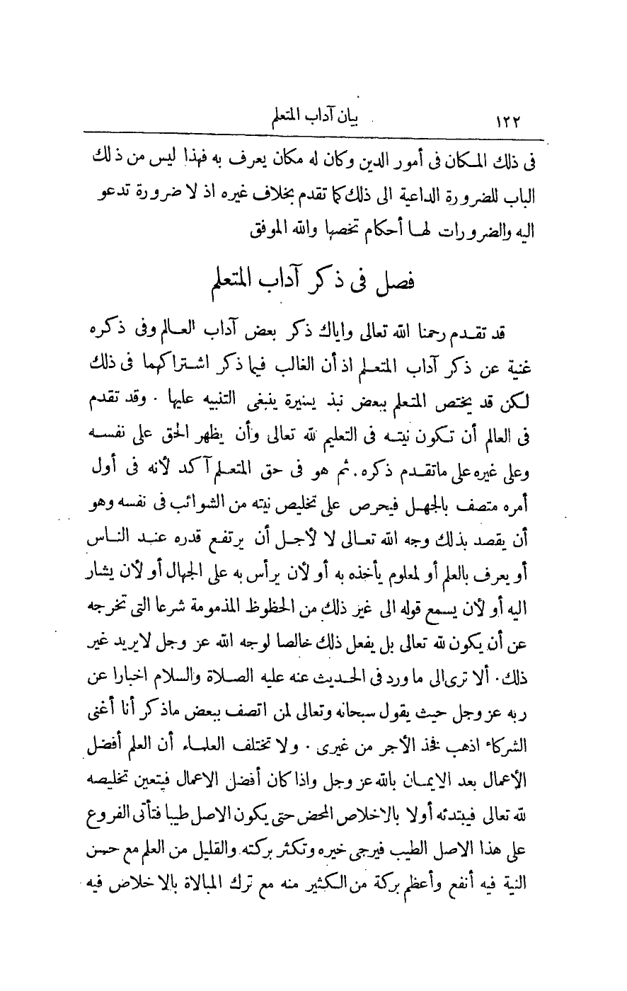 ِ قَدْ تَقَدَّمَ رَحِمَنَا اللَّهُ تَعَالَى وَإِيَّاكَ ذِكْرُ بَعْضِ آدَابِ الْعَالِمِ، وَفِي ذِكْرِهِ غُنْيَةٌ عَنْ ذِكْرِ آدَابِ الْمُتَعَلِّمِ إذْ أَنَّ الْغَالِبَ فِيمَا ذُكِرَ اشْتِرَاكُهُمَا فِي ذَلِكَ، لَكِنْ قَدْ يَخْتَصُّ الْمُتَعَلِّمُ بِبَعْضِ نُبَذٍ يَسِيرَةٍ يَنْبَغِي التَّنْبِيهُ عَلَيْهَا، وَقَدْ تَقَدَّمَ فِي الْعَالِمِ أَنْ تَكُونَ نِيَّتُهُ فِي التَّعْلِيمِ لِلَّهِ تَعَالَى، وَأَنْ يُظْهِرَ الْحَقَّ عَلَى نَفْسِهِ، وَعَلَى غَيْرِهِ عَلَى مَا تَقَدَّمَ ذِكْرُهُ، ثُمَّ هُوَ فِي حَقِّ الْمُتَعَلِّمِ آكَدُ؛ لِأَنَّهُ فِي أَوَّلِ أَمْرِهِ مُتَّصِفٌ بِالْجَهْلِ فَيَحْرِصُ عَلَى تَخْلِيصِ نِيَّتِهِ مِنْ الشَّوَائِبِ فِي نَفْسِهِ، وَهُوَ أَنْ يَقْصِدَ بِذَلِكَ وَجْهَ اللَّهِ تَعَالَى لَا لِأَجْلِ أَنْ يَرْتَفِعَ قَدْرُهُ عِنْدَ النَّاسِ، أَوْ يُعْرَفَ بِالْعِلْمِ، أَوْ لِمَعْلُومٍ يَأْخُذُهُ بِهِ، أَوْ لَأَنْ يَرْأَسَ بِهِ عَلَى الْجُهَّالِ، أَوْ لَأَنْ يُشَارَ إلَيْهِ، أَوْ لَأَنْ يُسْمَعَ قَوْلُهُ إلَى غَيْرِ ذَلِكَ مِنْ الْحُظُوظِ الْمَذْمُومَةِ شَرْعًا الَّتِي تُخْرِجُهُ عَنْ أَنْ يَكُونَ لِلَّهِ تَعَالَى، بَلْ يَفْعَلَ ذَلِكَ خَالِصًا لِوَجْهِ اللَّهِ عَزَّ وَجَلَّ لَا يُرِيدُ غَيْرَ ذَلِكَ، أَلَا تَرَى إلَى مَا وَرَدَ فِي الْحَدِيثِ عَنْهُ - عَلَيْهِ الصَّلَاةُ وَالسَّلَامُ - إخْبَارًا عَنْ رَبِّهِ عَزَّ وَجَلَّ حَيْثُ يَقُولُ سُبْحَانَهُ وَتَعَالَى لِمَنْ اتَّصَفَ بِبَعْضِ مَا ذُكِرَ: «أَنَا أَغْنَى الشُّرَكَاءِ اذْهَبْ فَخُذْ الْأَجْرَ مِنْ غَيْرِي»