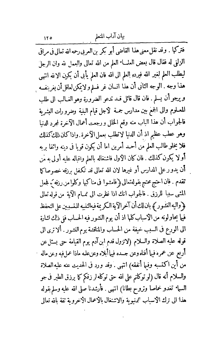 وَقَدْ نَقَلَ مَعْنَى هَذَا الْقَاضِي أَبُو بَكْرِ بْنُ الْعَرَبِيِّ - رَحِمَهُ اللَّهُ تَعَالَى - فِي مَرَاقِي الزُّلْفَى لَهُ فَقَالَ قَالَ بَعْضُ الْعُلَمَاءِ: الْعِلْمُ مِنْ اللَّهِ تَعَالَى، وَالْعَمَلُ لِلَّهِ، وَإِنَّ الرَّجُلَ لَيَطْلُبُ الْعِلْمَ لِغَيْرِ اللَّهِ فَيَرُدُّهُ الْعِلْمُ إلَى اللَّهِ، فَإِنَّ الْعِلْمَ يَأْبَى أَنْ يَكُونَ إلَّا لِلَّهِ انْتَهَى. هَذَا وَجْهٌ.