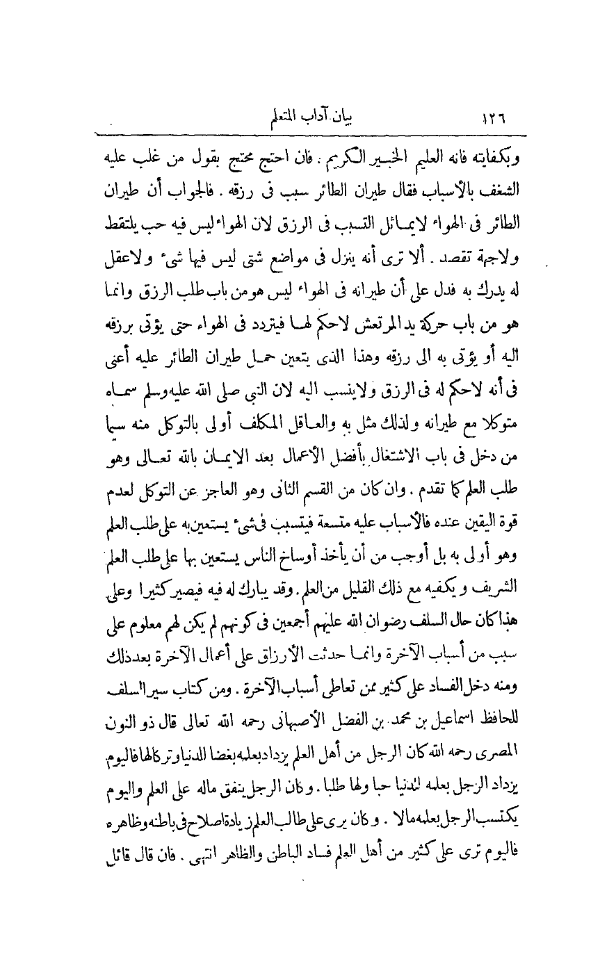 وَبِكِفَايَتِهِ، فَإِنَّهُ الْعَلِيمُ الْخَبِيرُ الْكَرِيمُ، فَإِنْ احْتَجَّ مُحْتَجٌّ بِقَوْلِ مَنْ غَلَبَ عَلَيْهِ الشَّغَفُ بِالْأَسْبَابِ فَقَالَ: طَيَرَانُ الطَّائِرِ سَبَبٌ فِي رِزْقِهِ فَالْجَوَابُ أَنَّ طَيَرَانَ الطَّائِرِ فِي الْهَوَاءِ لَا يُمَاثِلُ التَّسَبُّبَ فِي الرِّزْقِ؛ لِأَنَّ الْهَوَاءَ لَيْسَ فِيهِ حَبٌّ يُلْتَقَطُ، وَلَا جِهَةٌ تُقْصَدُ أَلَا تَرَى أَنَّهُ يَنْزِلُ فِي مَوَاضِعَ شَتَّى لَيْسَ فِيهَا شَيْءٌ، وَلَا عَقْلَ لَهُ يُدْرِكُ بِهِ، فَدَلَّ عَلَى أَنَّ طَيَرَانَهُ فِي الْهَوَاءِ لَيْسَ هُوَ مِنْ بَابِ طَلَبِ الرِّزْقِ، وَإِنَّمَا هُوَ مِنْ بَابِ حَرَكَةِ يَدِ الْمُرْتَعِشِ لَا حُكْمَ لَهَا، فَيَتَرَدَّدُ فِي الْهَوَاءِ حَتَّى يُؤْتَى بِرِزْقِهِ إلَيْهِ، أَوْ يُؤْتَى بِهِ إلَى رِزْقِهِ، وَهَذَا الَّذِي يَتَعَيَّنُ حَمْلُ طَيَرَانِ الطَّائِرِ عَلَيْهِ أَعْنِي فِي أَنَّهُ لَا حُكْمَ لَهُ فِي الرِّزْقِ، وَلَا يُنْسَبُ إلَيْهِ؛ لِأَنَّ النَّبِيَّ - صَلَّى اللَّهُ عَلَيْهِ وَسَلَّمَ - سَمَّاهُ مُتَوَكِّلًا مَعَ طَيَرَانِهِ، وَلِذَلِكَ مَثَّلَ بِهِ، وَالْعَاقِلُ الْمُكَلَّفُ أَوْلَى بِالتَّوَكُّلِ مِنْهُ سِيَّمَا مَنْ دَخَلَ فِي بَابِ الِاشْتِغَالِ بِأَفْضَلِ الْأَعْمَالِ بَعْدَ الْإِيمَانِ بِاَللَّهِ تَعَالَى، وَهُوَ طَلَبُ الْعِلْمِ كَمَا تَقَدَّمَ، وَإِنْ كَانَ مِنْ الْقِسْمِ الثَّانِي، وَهُوَ الْعَاجِزُ عَنْ التَّوَكُّلِ لِعَدَمِ قُوَّةِ الْيَقِينِ عِنْدَهُ فَالْأَسْبَابُ عَلَيْهِ مُتَّسِعَةٌ فَيَتَسَبَّبُ فِي شَيْءٍ يَسْتَعِينُ بِهِ عَلَى طَلَبِ الْعِلْمِ، وَهُوَ أَوْلَى بِهِ، بَلْ أَوْجَبُ مِنْ أَنْ يَأْخُذَ أَوْسَاخَ النَّاسِ يَسْتَعِينُ بِهَا عَلَى طَلَبِ الْعِلْمِ الشَّرِيفِ، وَيَكْفِيهِ مَعَ ذَلِكَ الْقَلِيلُ مِنْ الْعِلْمِ، وَقَدْ يُبَارَكُ لَهُ فِيهِ فَيَصِيرُ كَثِيرًا.