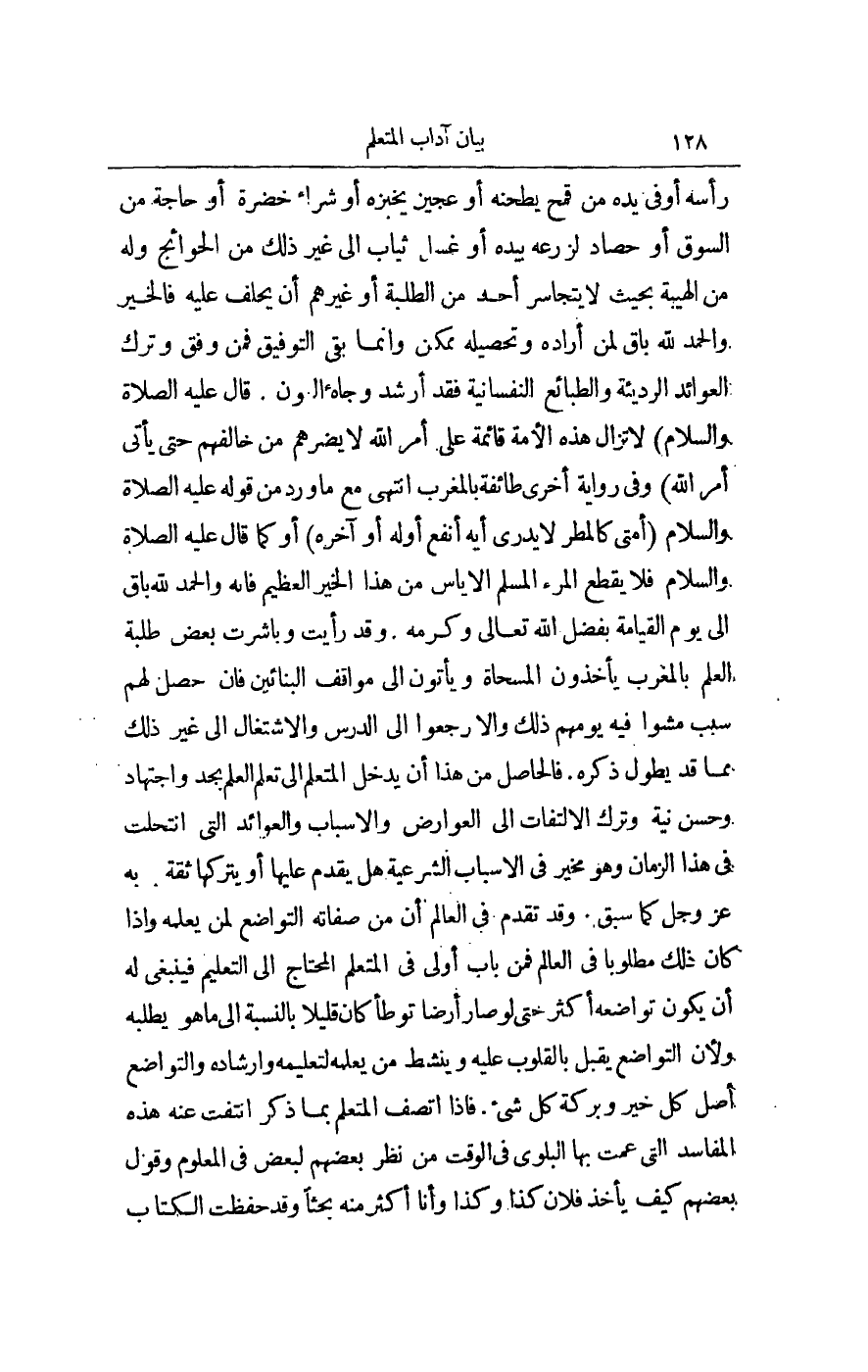 مَعَ مَا وَرَدَ مِنْ قَوْلِهِ: - عَلَيْهِ الصَّلَاةُ وَالسَّلَامُ - «أُمَّتِي كَالْمَطَرِ لَا يُدْرَى أَيُّهُ أَنْفَعُ أَوَّلُهُ، أَوْ آخِرُهُ» ، أَوْ كَمَا قَالَ: - عَلَيْهِ الصَّلَاةُ وَالسَّلَامُ - فَلَا يَقْطَعُ الْمَرْءُ الْمُسْلِمُ الْإِيَاسَ مِنْ هَذَا الْخَيْرِ الْعَظِيمِ فَإِنَّهُ، وَالْحَمْدُ لِلَّهِ بَاقٍ إلَى يَوْمِ الْقِيَامَةِ بِفَضْلِ اللَّهِ تَعَالَى، وَكَرَمِهِ، وَقَدْ رَأَيْت وَبَاشَرْت بَعْضَ طَلَبَةِ الْعِلْمِ بِالْمَغْرِبِ يَأْخُذُونَ الْمِسْحَاةَ، وَيَأْتُونَ إلَى مَوَاقِفِ الْبَنَّائِينَ، فَإِنْ حَصَلَ لَهُمْ سَبَبٌ مَشَوْا فِيهِ يَوْمَهُمْ ذَلِكَ، وَإِلَّا رَجَعُوا إلَى الدَّرْسِ، وَالِاشْتِغَالِ إلَى غَيْرِ ذَلِكَ مِمَّا قَدْ يَطُولُ ذِكْرُهُ فَالْحَاصِلُ مِنْ هَذَا أَنْ يَدْخُلَ الْمُتَعَلِّمُ إلَى تَعَلُّمِ الْعِلْمِ بِجِدٍّ، وَاجْتِهَادٍ، وَحُسْنِ نِيَّةٍ، وَتَرْكِ الِالْتِفَاتِ إلَى الْعَوَارِضِ، وَالْأَسْبَابِ، وَالْعَوَائِدِ الَّتِي اُنْتُحِلَتْ فِي هَذَا الزَّمَانِ، وَهُوَ مُخَيَّرٌ فِي الْأَسْبَابِ الشَّرْعِيَّةِ هَلْ يُقْدِمُ عَلَيْهَا، أَوْ يَتْرُكُهَا ثِقَةً بِهِ عَزَّ وَجَلَّ كَمَا سَبَقَ