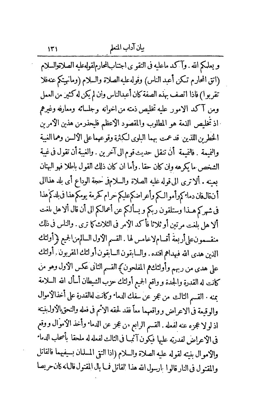 وَمِنْ آكَدِ الْأُمُورِ عَلَيْهِ تَخْلِيصُ ذِمَّتِهِ مِنْ إخْوَانِهِ، وَجُلَسَائِهِ، وَمَعَارِفِهِ، وَغَيْرِهِمْ إذْ تَخْلِيصُ الذِّمَّةِ هُوَ الْمَطْلُوبُ، وَالْمَقْصُودُ الْأَعْظَمُ فَلْيُحْذَرْ مِنْ هَذَيْنِ الْأَمْرَيْنِ الْخَطِرَيْنِ اللَّذَيْنِ قَدْ عَمَّتْ بِهِمَا الْبَلْوَى لِكَثْرَةِ وُقُوعِهِمَا عَلَى الْأَلْسُنِ، وَهُمَا الْغِيبَةُ، وَالنَّمِيمَةُ فَالنَّمِيمَةُ: أَنْ تَنْقُلَ حَدِيثَ قَوْمٍ إلَى آخَرِينَ، وَالْغِيبَةُ: أَنْ تَقُولَ فِي غَيْبَةِ الشَّخْصِ مَا يَكْرَهُهُ، وَإِنْ كَانَ حَقًّا، وَأَمَّا إنْ كَانَ ذَلِكَ الْقَوْلُ بَاطِلًا فَهُوَ الْبُهْتَانُ بِعَيْنِهِ أَلَا تَرَى إلَى قَوْلِهِ - عَلَيْهِ الصَّلَاةُ وَالسَّلَامُ - فِي حَجَّةِ الْوَدَاعِ «أَيُّ بَلَدٍ هَذَا إلَى أَنْ قَالَ: فَإِنَّ دِمَاءَكُمْ، وَأَمْوَالَكُمْ، وَأَعْرَاضَكُمْ عَلَيْكُمْ حَرَامٌ كَحُرْمَةِ يَوْمِكُمْ هَذَا فِي بَلَدِكُمْ هَذَا فِي شَهْرِكُمْ هَذَا، وَسَتَلْقَوْنَ رَبَّكُمْ، وَيَسْأَلُكُمْ عَنْ أَعْمَالِكُمْ إلَى أَنْ قَالَ: أَلَا هَلْ بَلَّغْت أَلَا هَلْ بَلَّغْت مَرَّتَيْنِ، أَوْ ثَلَاثًا» فَأَكَّدَ الْأَمْرَ فِي الثَّلَاثِ كَمَا تَرَى، وَالنَّاسُ فِي ذَلِكَ مُنْقَسِمُونَ عَلَى أَرْبَعَةِ أَقْسَامٍ لَا خَامِسَ لَهَا: