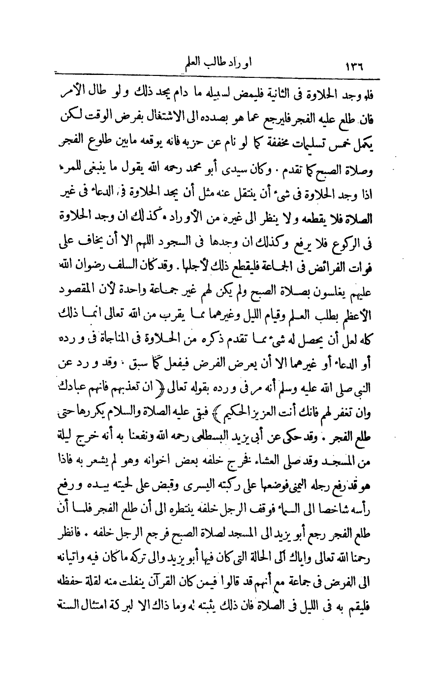 وَقَدْ كَانَ السَّلَفُ - رِضْوَانُ اللَّهِ عَلَيْهِمْ - يُغْلِسُونَ بِصَلَاةِ الصُّبْحِ، وَلَمْ يَكُنْ لَهُمْ غَيْرُ جَمَاعَةٍ وَاحِدَةٍ؛ لِأَنَّ الْمَقْصُودَ الْأَعْظَمَ بِطَلَبِ الْعِلْمِ، وَقِيَامِ اللَّيْلِ، وَغَيْرِهِمَا مِمَّا يُقَرِّبُ مِنْ اللَّهِ تَعَالَى إنَّمَا ذَلِكَ كُلُّهُ لَعَلَّ أَنْ يَحْصُلَ لَهُ شَيْءٌ مِمَّا تَقَدَّمَ ذِكْرُهُ مِنْ الْحَلَاوَةِ فِي الْمُنَاجَاةِ فِي وِرْدِهِ، أَوْ الدُّعَاءِ، أَوْ غَيْرِهِمَا، إلَّا أَنْ يَعْرِضَ الْفَرْضُ فَيَفْعَلَ كَمَا سَبَقَ، وَقَدْ وَرَدَ عَنْ النَّبِيِّ - صَلَّى اللَّهُ عَلَيْهِ وَسَلَّمَ - «أَنَّهُ مَرَّ فِي وِرْدِهِ بِقَوْلِهِ تَعَالَى {إِنْ تُعَذِّبْهُمْ فَإِنَّهُمْ عِبَادُكَ وَإِنْ تَغْفِرْ لَهُمْ فَإِنَّكَ أَنْتَ الْعَزِيزُ الْحَكِيمُ} [المائدة: 118] فَبَقِيَ - عَلَيْهِ الصَّلَاةُ وَالسَّلَامُ - يُكَرِّرُهَا حَتَّى طَلَعَ الْفَجْرُ» ، وَقَدْ حُكِيَ عَنْ أَبِي يَزِيدَ الْبِسْطَامِيِّ - رَحِمَهُ اللَّهُ -، وَنَفَعَنَا بِهِ أَنَّهُ خَرَجَ لَيْلَةً مِنْ الْمَسْجِدِ، وَقَدْ صَلَّى الْعِشَاءَ فَخَرَجَ خَلْفَهُ بَعْضُ إخْوَانِهِ، وَهُوَ لَمْ يَشْعُرْ بِهِ، فَإِذَا هُوَ قَدْ رَفَعَ رِجْلَهُ الْيُمْنَى فَوَضَعَهَا عَلَى رُكْبَتِهِ الْيُسْرَى، وَقَبَضَ عَلَى لِحْيَتِهِ بِيَدِهِ، وَرَفَعَ رَأْسَهُ شَاخِصًا إلَى السَّمَاءِ، فَوَقَفَ الرَّجُلُ خَلْفَهُ يَنْتَظِرُهُ إلَى أَنْ طَلَعَ الْفَجْرُ فَلَمَّا أَنْ طَلَعَ الْفَجْرُ رَجَعَ أَبُو يَزِيدَ إلَى الْمَسْجِدِ لِصَلَاةِ الصُّبْحِ، فَرَجَعَ الرَّجُلُ خَلْفَهُ، فَانْظُرْ رَحِمَنَا اللَّهُ تَعَالَى وَإِيَّاكَ إلَى الْحَالَةِ الَّتِي كَانَ فِيهَا أَبُو يَزِيدَ، وَإِلَى تَرْكِهِ مَا كَانَ فِيهِ، وَإِتْيَانِهِ إلَى الْفَرْضِ فِي جَمَاعَةٍ مَعَ أَنَّهُمْ قَدْ قَالُوا فِيمَنْ كَانَ الْقُرْآنُ يَنْفَلِتُ مِنْهُ لِقِلَّةِ حِفْظِهِ: فَلْيَقُمْ بِهِ فِي اللَّيْلِ فِي الصَّلَاةِ، فَإِنَّ ذَلِكَ يُثَبِّتُهُ لَهُ، وَمَا ذَاكَ إلَّا لِبَرَكَةِ امْتِثَالِ السُّنَّةِ