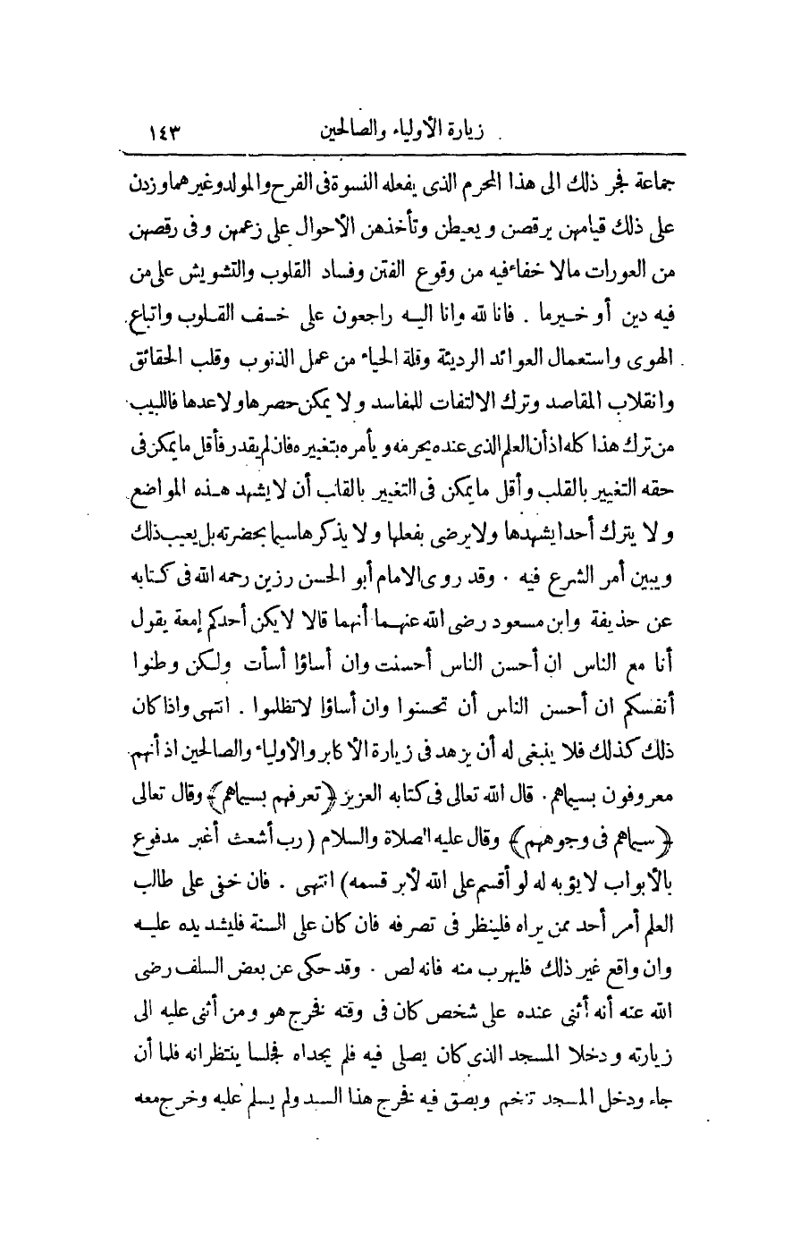 وَإِذَا كَانَ ذَلِكَ كَذَلِكَ فَلَا يَنْبَغِي لَهُ أَنْ يَزْهَدَ فِي زِيَارَةِ الْأَكَابِرِ، وَالْأَوْلِيَاءِ، وَالصَّالِحِينَ إذْ أَنَّهُمْ مَعْرُوفُونَ بِسِيمَاهُمْ قَالَ اللَّهُ تَعَالَى فِي كِتَابِهِ الْعَزِيزِ {تَعْرِفُهُمْ بِسِيمَاهُمْ} [البقرة: 273] ، وَقَالَ تَعَالَى {سِيمَاهُمْ فِي وُجُوهِهِمْ} [الفتح: 29] ، وَقَالَ - عَلَيْهِ الصَّلَاةُ وَالسَّلَامُ - «رُبَّ أَشْعَثَ أَغْبَرَ مَدْفُوعٍ بِالْأَبْوَابِ لَا يُؤْبَهُ لَهُ لَوْ أَقْسَمَ عَلَى اللَّهِ لَأَبَرَّ قَسَمَهُ» انْتَهَى.