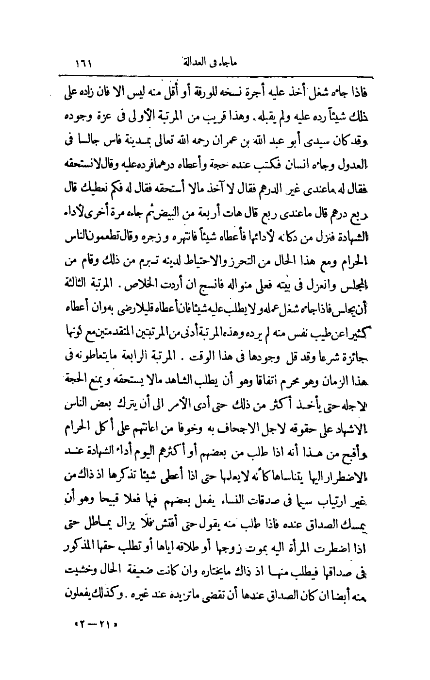 فَإِذَا جَاءَهُ شُغْلٌ أَخَذَ عَلَيْهِ أُجْرَةَ نَسْخِهِ لِلْوَرَقَةِ، أَوْ أَقَلَّ مِنْهُ لَيْسَ إلَّا، فَإِنْ زَادَهُ عَلَى ذَلِكَ شَيْئًا رَدَّهُ عَلَيْهِ، وَلَمْ يَقْبَلْهُ، وَهَذَا قَرِيبٌ مِنْ الْمَرْتَبَةِ الْأُولَى فِي عِزَّةِ وُجُودِهِ، وَقَدْ كَانَ سَيِّدِي أَبُو عَبْدِ اللَّهِ بْنُ عِمْرَانَ - رَحِمَهُ اللَّهُ تَعَالَى - بِمَدِينَةِ فَاسَ جَالِسًا فِي الْعُدُولِ، وَجَاءَهُ إنْسَانٌ فَكَتَبَ عِنْدَهُ حُجَّةً، وَأَعْطَاهُ دِرْهَمًا فَرَدَّهُ عَلَيْهِ، وَقَالَ: لَا نَسْتَحِقُّهُ فَقَالَ لَهُ: مَا عِنْدِي غَيْرُ الدِّرْهَمِ فَقَالَ: لَا آخُذُ مَا لَا أَسْتَحِقُّهُ فَقَالَ لَهُ: فَكَمْ نُعْطِيكَ قَالَ: رُبْعُ دِرْهَمٍ قَالَ: مَا عِنْدِي رُبْعٌ قَالَ: هَاتِ أَرْبَعَةً مِنْ الْبِيضِ، ثُمَّ جَاءَهُ مَرَّةً أُخْرَى لِأَدَاءِ الشَّهَادَةِ فَنَزَلَ مِنْ دُكَّانِهِ لِأَدَائِهَا فَأَعْطَاهُ شَيْئًا فَانْتَهَرَهُ، وَزَجَرَهُ قَالَ: تُطْعِمُونَ النَّاسَ الْحَرَامَ، وَمَعَ هَذَا الْحَالِ مِنْ التَّحَرُّزِ وَالِاحْتِيَاطِ لِدِينِهِ تَبَرَّمَ مِنْ ذَلِكَ، وَقَامَ مِنْ الْمَجْلِسِ، وَانْعَزَلَ فِي الْبَيْتِ فَعَلَى مِنْوَالِهِ فَانْسِجْ إنْ أَرَدْت الْخَلَاصَ.