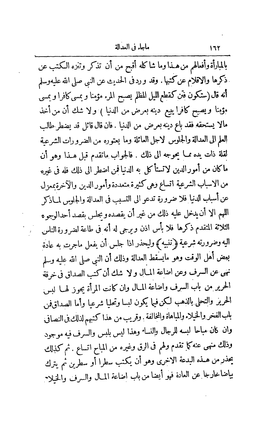 (تَنْبِيهٌ) ، وَلْيَحْذَرْ إذَا جَلَسَ أَنْ يَفْعَلَ مَا جَرَتْ بِهِ عَادَةُ بَعْضِ أَهْلِ الْوَقْتِ، وَهُوَ مَا يُسْقِطُ الْعَدَالَةَ، وَذَلِكَ «أَنَّ النَّبِيَّ - صَلَّى اللَّهُ عَلَيْهِ وَسَلَّمَ - نَهَى عَنْ السَّرَفِ، وَعَنْ إضَاعَةِ الْمَالِ» ، وَلَا شَكَّ أَنَّ كَتْبَ الصَّدَاقِ فِي خِرْقَةِ الْحَرِيرِ مِنْ بَابِ السَّرَفِ، وَإِضَاعَةِ الْمَالِ، وَإِنْ كَانَتْ الْمَرْأَةُ يَجُوزُ لَهَا لُبْسُ الْحَرِيرِ، وَالتَّحَلِّي بِالذَّهَبِ لَكِنْ فِيمَا يَكُونُ لُبْسًا وَتَحَلِّيًا شَرْعِيًّا، وَأَمَّا الصَّدَاقُ فَمِنْ بَابِ الْفَخْرِ، وَالْخُيَلَاءِ، وَالْمُبَاهَاةِ، وَالْمُخَالَفَةِ، وَقَرِيبٌ مِنْ هَذَا كَتْبُهُمْ لِذَلِكَ فِي النَّصَّافِي، وَإِنْ كَانَ مُبَاحًا لُبْسُهُ لِلرِّجَالِ، وَالنِّسَاءِ، وَهَذَا لَيْسَ بِلُبْسٍ، وَالسَّرَفُ فِيهِ مَوْجُودٌ، وَذَلِكَ مَنْهِيٌّ عَنْهُ كَمَا تَقَدَّمَ، وَلَهُمْ فِي الرَّقِّ، وَغَيْرِهِ مِنْ الْمُبَاحِ اتِّسَاعٌ، ثُمَّ كَذَلِكَ يُحْذَرُ مِنْ هَذِهِ الْبِدْعَةِ الْأُخْرَى، وَهُوَ أَنْ يَكْتُبَ سَطْرًا أَوْ سَطْرَيْنِ ثُمَّ يَتْرُكَ بَيَاضًا خَارِجًا عَنْ الْعَادَةِ، فَهُوَ أَيْضًا مِنْ بَابِ إضَاعَةِ الْمَالِ، وَالسَّرَفِ، وَالْخُيَلَاءِ