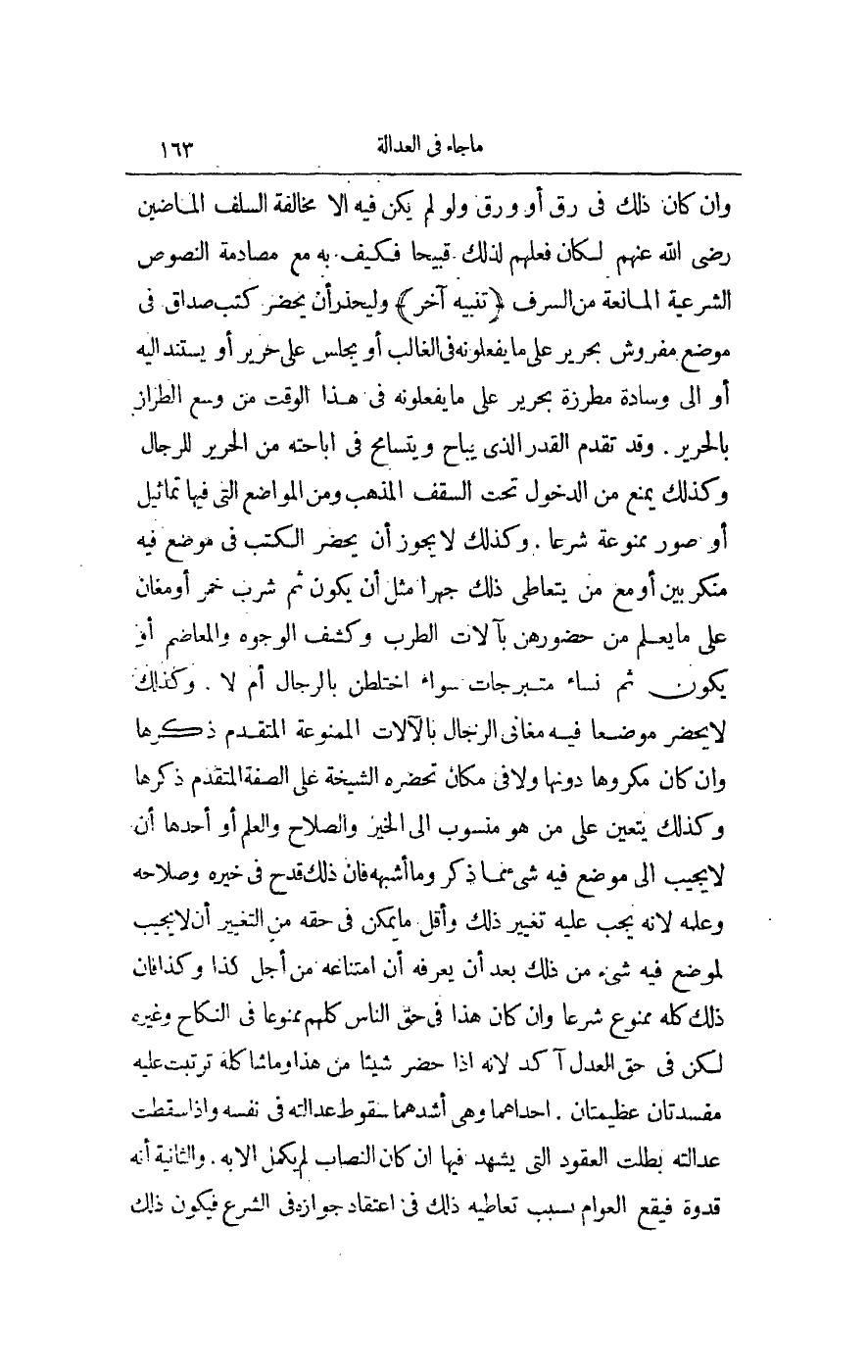 وَكَذَلِكَ لَا يَحْضُرُ مَوْضِعًا فِيهِ مَغَانِي الرِّجَالِ بِالْآلَاتِ الْمَمْنُوعَةِ الْمُتَقَدِّمِ ذِكْرُهَا، وَإِنْ كَانَ مَكْرُوهًا دُونَهَا، وَلَا فِي مَكَان تَحْضُرُهُ الشَّيْخَةُ عَلَى الصِّفَةِ الْمُتَقَدِّمِ ذِكْرُهَا، وَكَذَلِكَ يَتَعَيَّنُ عَلَى مَنْ هُوَ مَنْسُوبٌ إلَى الْخَيْرِ، وَالصَّلَاحِ، وَالْعِلْمِ، أَوْ أَحَدِهَا أَنْ لَا يُجِيبَ إلَى مَوْضِعٍ فِيهِ شَيْءٌ مِمَّا ذُكِرَ، وَمَا أَشْبَهَهُ فَإِنَّ ذَلِكَ قَدْحٌ فِي خَيْرِهِ، وَصَلَاحِهِ، وَعِلْمِهِ؛ لِأَنَّهُ يَجِبُ عَلَيْهِ تَغْيِيرُ ذَلِكَ، وَأَقَلُّ مَا يُمْكِنُ فِي حَقِّهِ مِنْ التَّغْيِيرِ أَنْ لَا يُجِيبَ لِمَوْضِعٍ فِيهِ شَيْءٌ مِنْ ذَلِكَ بَعْدَ أَنْ يُعَرِّفَهُ أَنَّ امْتِنَاعَهُ مِنْ أَجْلِ كَذَا وَكَذَا، فَإِنَّ ذَلِكَ كُلَّهُ مَمْنُوعٌ شَرْعًا، وَإِنْ كَانَ هَذَا فِي حَقِّ النَّاسِ كُلِّهِمْ مَمْنُوعًا فِي النِّكَاحِ وَغَيْرِهِ، لَكِنْ فِي حَقِّ الْعَدْلِ آكَدُ؛ لِأَنَّهُ إذَا حَضَرَ شَيْئًا مِنْ هَذَا، وَمَا شَاكَلَهُ تَرَتَّبَتْ عَلَيْهِ مَفْسَدَتَانِ عَظِيمَتَانِ: