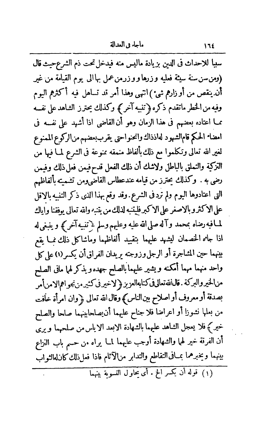 (تَنْبِيهٌ آخَرُ) ، وَيَنْبَغِي لَهُ إذَا جَاءَهُ الْخَصْمَانِ لِيَشْهَدَ عَلَيْهِمَا بِتَقْيِيدِ أَلْفَاظِهِمَا، وَمَا شَاكَلَ ذَلِكَ مِمَّا يَقَعُ بَيْنَهُمَا حِينَ الْمُشَاجَرَةِ، أَوْ الرَّجُلُ وَزَوْجَتُهُ يُرِيدَانِ الْفِرَاقَ أَنْ يَكْسِرَ عَلَى كُلِّ وَاحِدٍ مِنْهُمَا مَهْمَا أَمْكَنَهُ، وَيُشِيرَ عَلَيْهِمَا بِالصُّلْحِ جَهْدَهُ، وَيَذْكُرَ لَهُمَا مَا فِي الصُّلْحِ مِنْ الْخَيْرِ، وَالْبَرَكَةِ قَالَ اللَّهُ تَعَالَى فِي كِتَابِهِ الْعَزِيزِ: {لا خَيْرَ فِي كَثِيرٍ مِنْ نَجْوَاهُمْ إِلا مَنْ أَمَرَ بِصَدَقَةٍ أَوْ مَعْرُوفٍ أَوْ إِصْلاحٍ بَيْنَ النَّاسِ} [النساء: 114] ، وَقَالَ اللَّهُ تَعَالَى {وَإِنِ امْرَأَةٌ خَافَتْ مِنْ بَعْلِهَا نُشُوزًا أَوْ إِعْرَاضًا فَلا جُنَاحَ عَلَيْهِمَا أَنْ يُصْلِحَا بَيْنَهُمَا صُلْحًا وَالصُّلْحُ خَيْرٌ} [النساء: 128] فَلَا يُعْجِلُ الشَّاهِدَ عَلَيْهِمَا بِالشَّهَادَةِ إلَّا بَعْدَ الْإِيَاسِ مِنْ صُلْحِهِمَا، وَيَرَى أَنَّ الْفُرْقَةَ خَيْرٌ لَهُمَا، وَالشَّهَادَةَ أَوْجَبُ عَلَيْهِمَا لِمَا يَرَاهُ مِنْ حَسْمِ بَابِ النِّزَاعِ بَيْنَهُمَا، وَيُخْبِرُهُمَا بِمَا فِي التَّقَاطُعِ وَالتَّدَابُرِ مِنْ الْآثَامِ، فَإِذَا فَعَلَ ذَلِكَ كَانَ لَهُ الثَّوَابُ