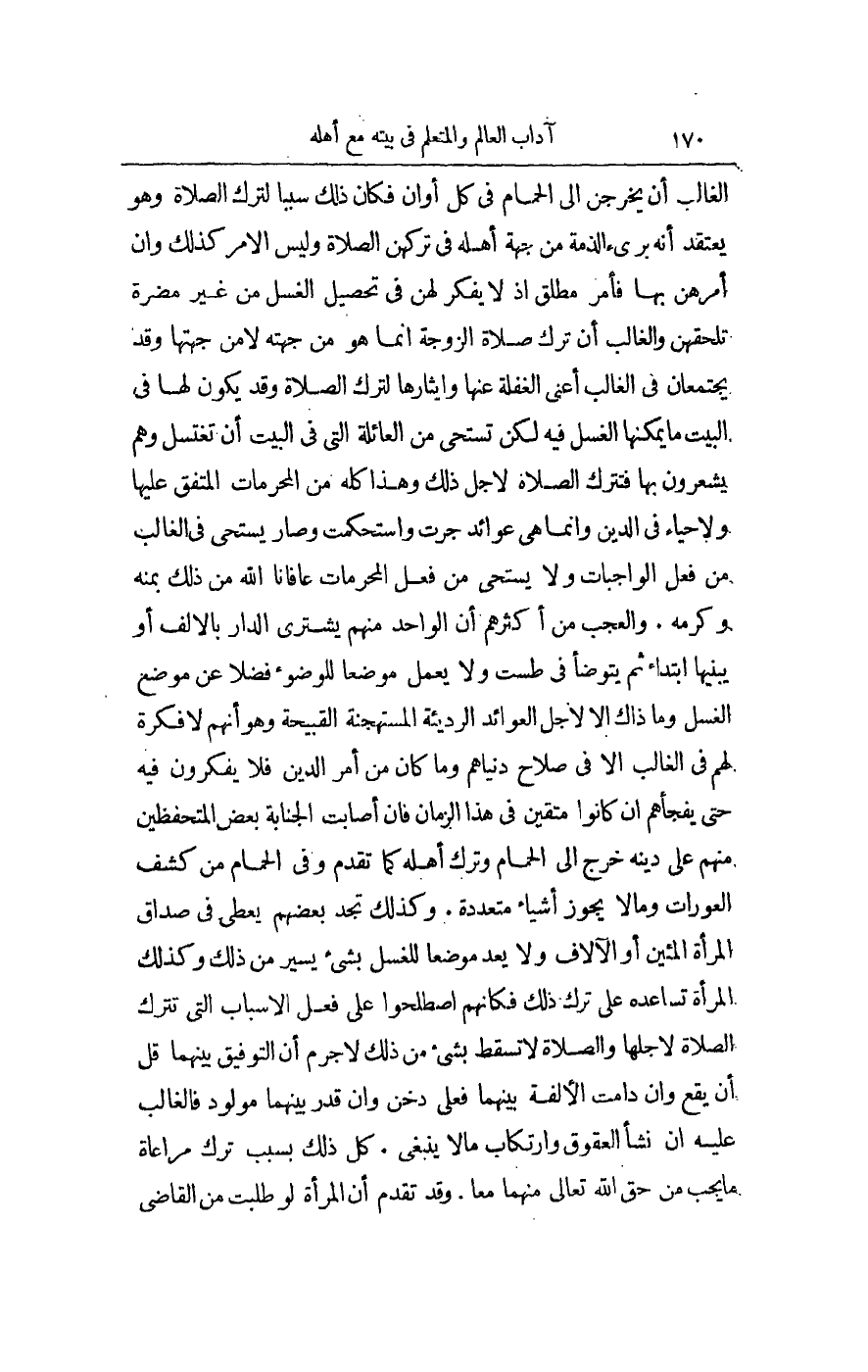 الْغَالِبُ أَنْ يَخْرُجْنَ إلَى الْحَمَّامِ فِي كُلِّ أَوَانٍ، فَكَانَ ذَلِكَ سَبَبًا لِتَرْكِ الصَّلَاةِ، وَهُوَ يَعْتَقِدُ أَنَّهُ بَرِيءُ الذِّمَّةِ مِنْ جِهَةِ أَهْلِهِ فِي تَرْكِهِنَّ الصَّلَاةَ، وَلَيْسَ الْأَمْرُ كَذَلِكَ، وَإِنْ أَمَرَهُنَّ بِهَا فَأَمْرٌ مُطْلَقٌ إذْ لَا يُفَكِّرُ لَهُنَّ فِي تَحْصِيلِ الْغُسْلِ مِنْ غَيْرِ مَضَرَّةٍ تَلْحَقُهُنَّ، وَالْغَالِبُ أَنَّ تَرْكَ صَلَاةِ الزَّوْجَةِ إنَّمَا هُوَ مِنْ جِهَتِهِ لَا مِنْ جِهَتِهَا، وَقَدْ يَجْتَمِعَانِ فِي الْغَالِبِ أَعْنِي الْغَفْلَةَ عَنْهَا، وَإِيثَارَهَا لِتَرْكِ الصَّلَاةِ، وَقَدْ يَكُونُ لَهَا فِي الْبَيْتِ مَا يُمْكِنُهَا الْغُسْلُ فِيهِ لَكِنْ تَسْتَحِي مِنْ الْعَائِلَةِ الَّتِي فِي الْبَيْتِ أَنْ تَغْتَسِلَ، وَهُمْ يَشْعُرُونَ بِهَا فَتَتْرُكَ الصَّلَاةَ لِأَجْلِ ذَلِكَ، وَهَذَا كُلُّهُ مِنْ الْمُحَرَّمَاتِ الْمُتَّفَقِ عَلَيْهَا، وَلَا حَيَاءَ فِي الدِّينِ، وَإِنَّمَا هِيَ عَوَائِدُ جَرَتْ، وَاسْتَحْكَمَتْ، وَصَارَ يُسْتَحَى فِي الْغَالِبِ مِنْ فِعْلِ الْوَاجِبَاتِ، وَلَا يُسْتَحَى مِنْ فِعْلِ الْمُحَرَّمَاتِ، عَافَانَا اللَّهُ مِنْ ذَلِكَ بِمَنِّهِ وَكَرَمِهِ.