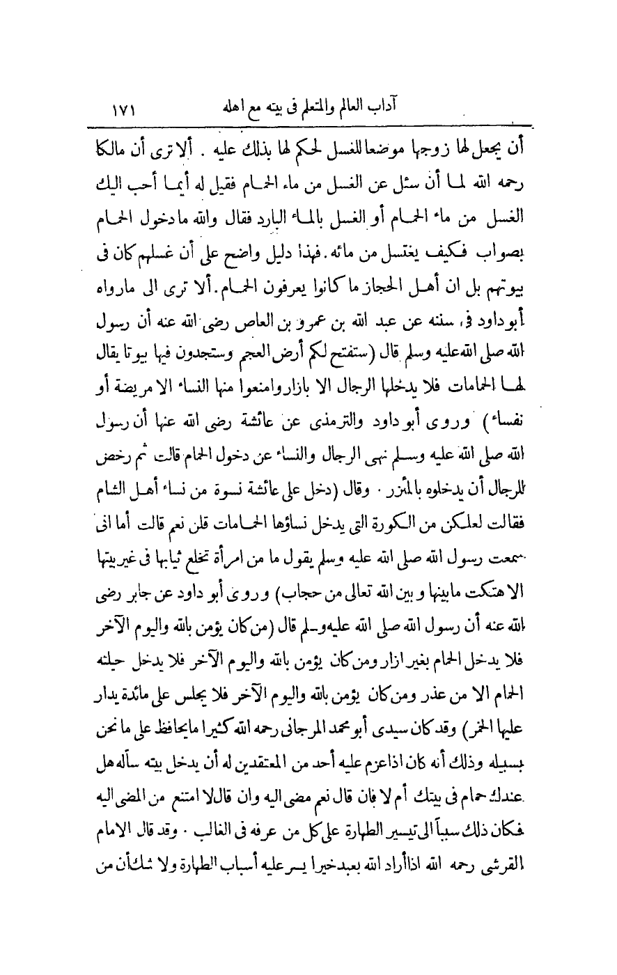 وَرَوَى أَبُو دَاوُد عَنْ جَابِرٍ - رَضِيَ اللَّهُ عَنْهُ - أَنَّ رَسُولَ اللَّهِ - صَلَّى اللَّهُ عَلَيْهِ وَسَلَّمَ - قَالَ: «مَنْ كَانَ يُؤْمِنُ بِاَللَّهِ وَالْيَوْمِ الْآخِرِ فَلَا يَدْخُلُ الْحَمَّامَ بِغَيْرِ إزَارٍ، وَمَنْ كَانَ يُؤْمِنُ بِاَللَّهِ وَالْيَوْمِ الْآخِرِ فَلَا يُدْخِلُ حَلِيلَتَهُ الْحَمَّامَ إلَّا مِنْ عُذْرٍ، وَمَنْ كَانَ يُؤْمِنُ بِاَللَّهِ، وَالْيَوْمِ الْآخِرِ فَلَا يَجْلِسُ عَلَى مَائِدَةٍ يُدَارُ عَلَيْهَا الْخَمْرُ» ، وَقَدْ كَانَ سَيِّدِي أَبُو مُحَمَّدٍ الْمَرْجَانِيُّ - رَحِمَهُ اللَّهُ - كَثِيرًا مَا يُحَافِظُ عَلَى مَا نَحْنُ بِسَبِيلِهِ، وَذَلِكَ أَنَّهُ كَانَ إذَا عَزَمَ عَلَيْهِ أَحَدٌ مِنْ الْمُعْتَقِدِينَ لَهُ أَنْ يَدْخُلَ بَيْتَهُ سَأَلَهُ هَلْ عِنْدَك حَمَّامٌ فِي بَيْتِك أَمْ لَا؟ فَإِنْ قَالَ: نَعَمْ مَضَى إلَيْهِ، وَإِنْ قَالَ: لَا امْتَنَعَ مِنْ الْمُضِيِّ إلَيْهِ فَكَانَ ذَلِكَ سَبَبًا إلَى تَيْسِيرِ الطَّهَارَةِ عَلَى كُلِّ مَنْ عَرَفَهُ فِي الْغَالِبِ.